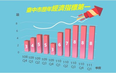 市長盧秀燕上任後,儘管面臨全球嚴重疫情,在招商與防疫並重下,台中經濟一路長紅,截至今年4月,台中不僅投資金額高達1兆477億元,最新出爐的經濟部統計資料更創佳績,今年第1季以8項經濟指標連三季穩坐全國第一,其中商業登記家數、實收資本額成長數2項指標蟬聯八季冠軍,領先各都。