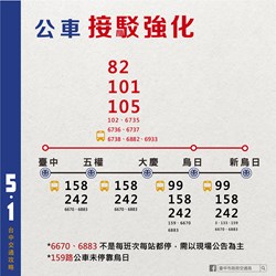交通局表示,經分析台鐵運量資料,歸納民眾乘車習慣,建議往返山、海線地區的民眾可多加利用甲后路、中清路及台灣大道的橫向公車;山線的豐原、潭子民眾也可以搭乘55及901等公車路線至松竹站,轉乘捷運綠線往返南區、烏日;台中-新烏日之間除了直行復興路的82、101、105路公車外,也有沿台鐵路廊直行的158、242路公車、6670、6883路公路客運可提供快速直達服務,台中市內整體公車、公路客運運輸能量尚可負荷,敬請民眾安心搭乘。