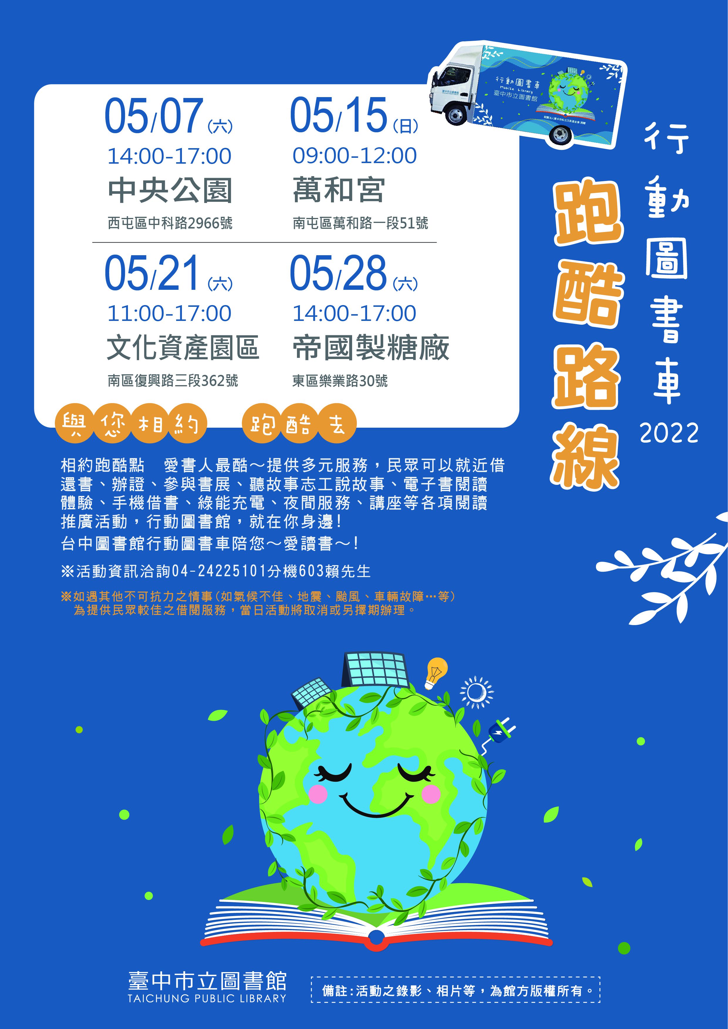 文化局指出,5月份的「跑酷行動圖書車」系列活動駐點服務,包括5月7日於中央公園、5月15日於萬和宮、5月21日於文化資產園區、5月28日於帝國製糖廠,詳細服務時間可至台中市立圖書館官網(https://reurl.cc/ZArRAW )或粉絲專頁(https://www.facebook.com/TaichungCityLibrary )查詢。