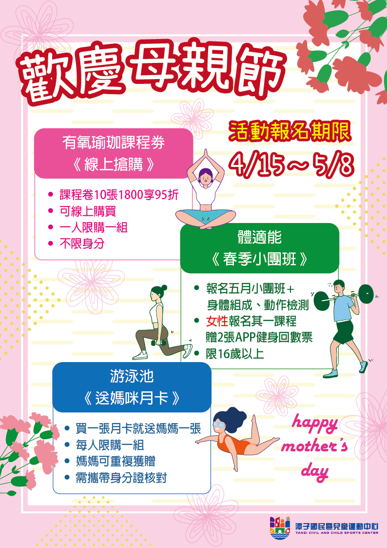 潭子國民暨兒童運動中心:凡於5月8日前購買月卡者,潭運將贈送1張月卡供媽媽使用,同時也開設體適能小型團體課程,提供循環肌力、戰繩燃脂、基礎重訓等豐富課程選擇;凡於活動期間報名5月課程者,將再贈身體組成及動作檢測1式,女性報名還可加贈APP健身回數票2張,續報或多人同行還可享額外優惠折扣。