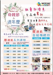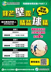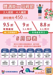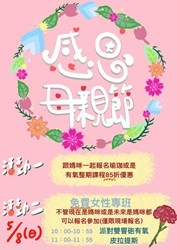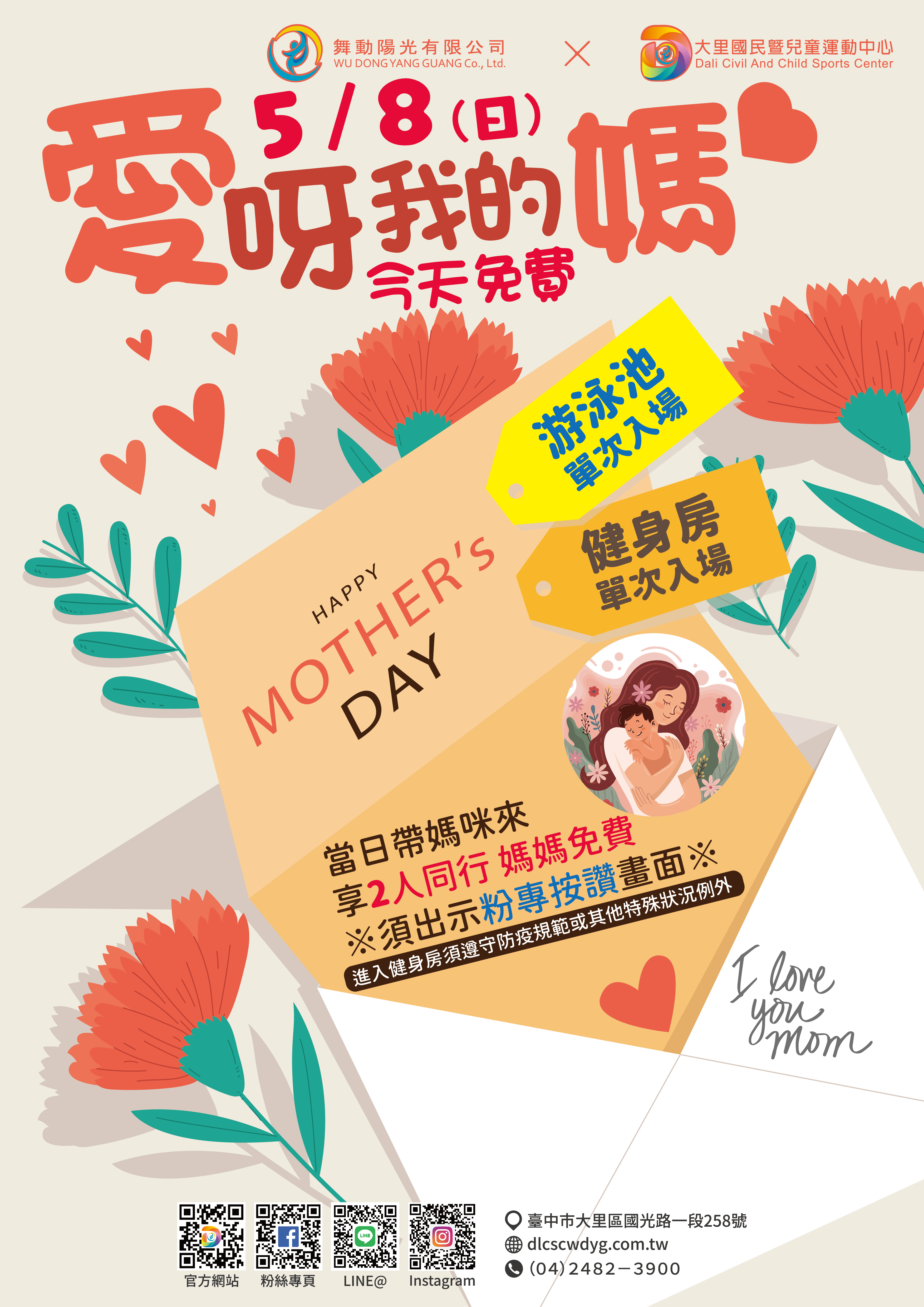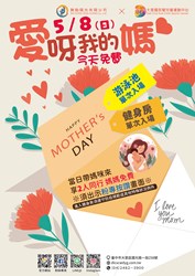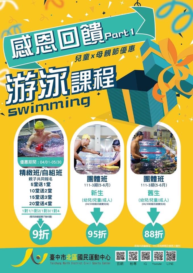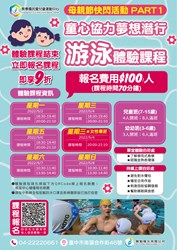 大里國民暨兒童運動中心:以「愛呀我的媽─今天免費」為主題,邀請市民朋友在母親節當日,與媽媽一同入場使用游泳池或健身房設施,即享「兩人同行,媽媽免費」優惠。