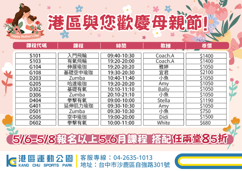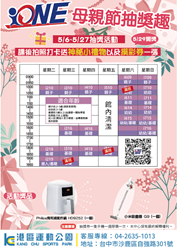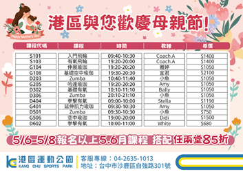 港區運動公園:即日起至8日期間報名5、6月課程者,可享任2堂85折優惠,課程內容包含飛輪有氧、空中瑜珈、哈達瑜珈、Zumba、拳擊有氧等;同時更與iONE體操合作母親節抽獎活動,凡於5月27日前參加課程者,於課後拍照打卡即贈神秘小禮物及摸彩券1張,將有機會抽中氣炸鍋、吸塵器等好禮。