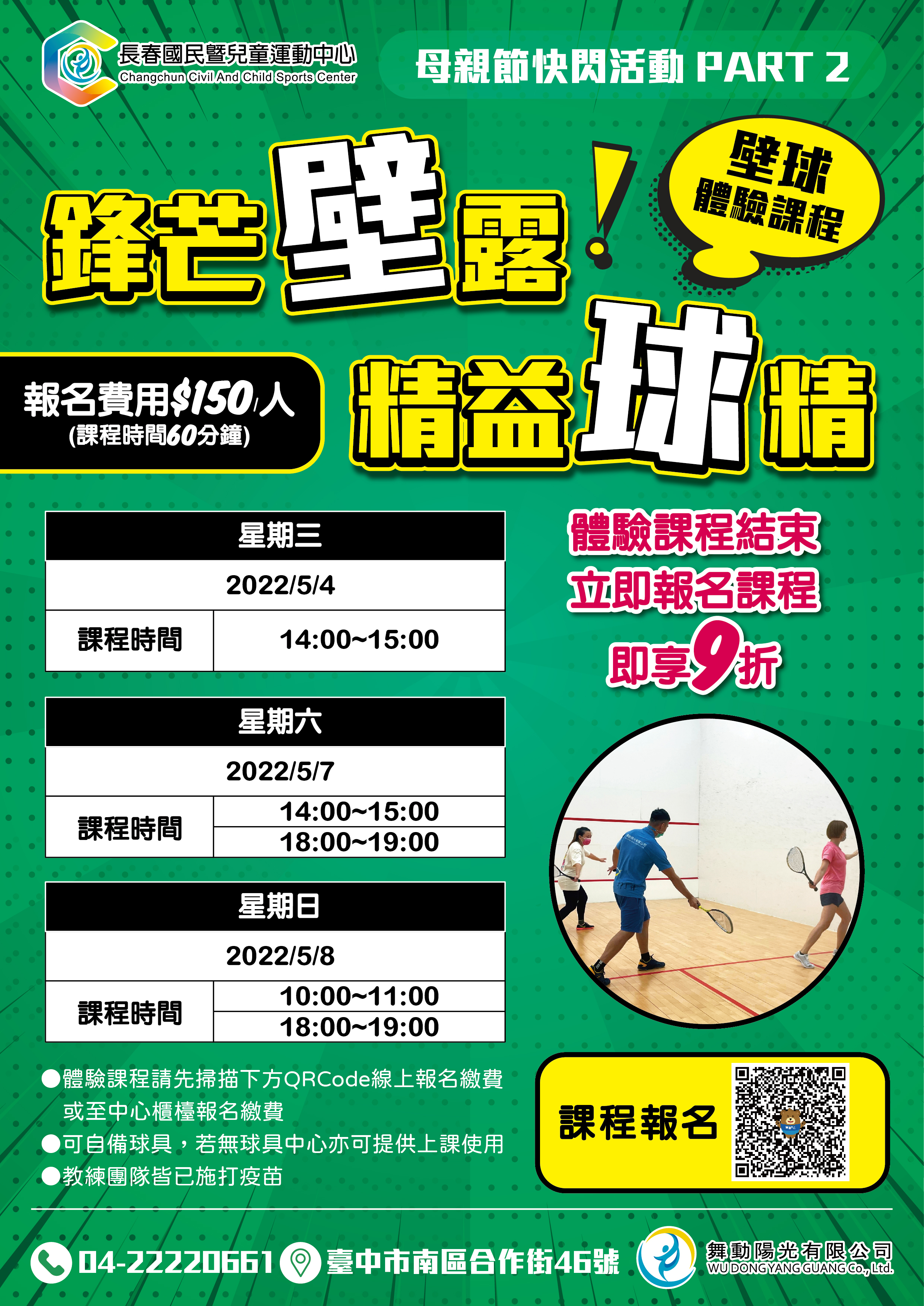 長春國民暨兒童運動中心:即日起至5月8日規劃母親節快閃活動,活動期間凡購買24堂私人教練課即享9折優惠價,同時,也提供游泳及壁球體驗課程的單堂體驗優惠價,完成體驗後不限時段購買課程,也可享9折優惠。