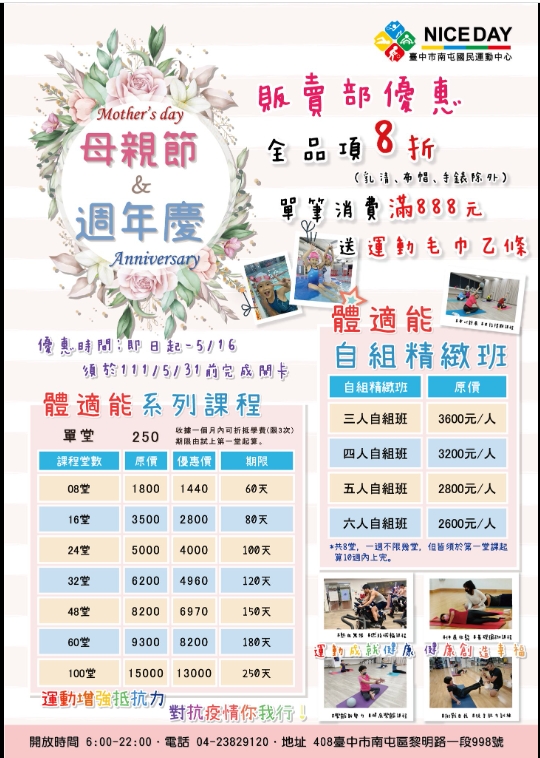 南屯國民運動中心:結合母親節及週年慶,規劃5月16日前運動商品販賣部全品項(其中乳清、布帽、手錶除外)均享8折優惠,滿888元還可獲贈運動毛巾,活動期間報名體適能、球類、游泳、健身系列課程、暑期營隊課程,或購買健身票卡、租用球場等還可再享專案優惠。