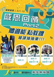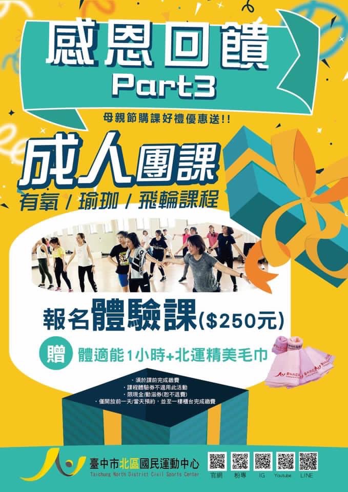 北區國民運動中心:在母親節當月,凡報名有氧、瑜珈或飛輪體驗課程,可獲贈免費使用體適能中心1小時及精美禮品;此外,5月15日前報名私人教練課還有機會獲贈健身月、季卡,還可抽獎拿好禮,獎品有彈性壓縮褲、機能壓縮背心、涼感機能外套、運動毛巾等。