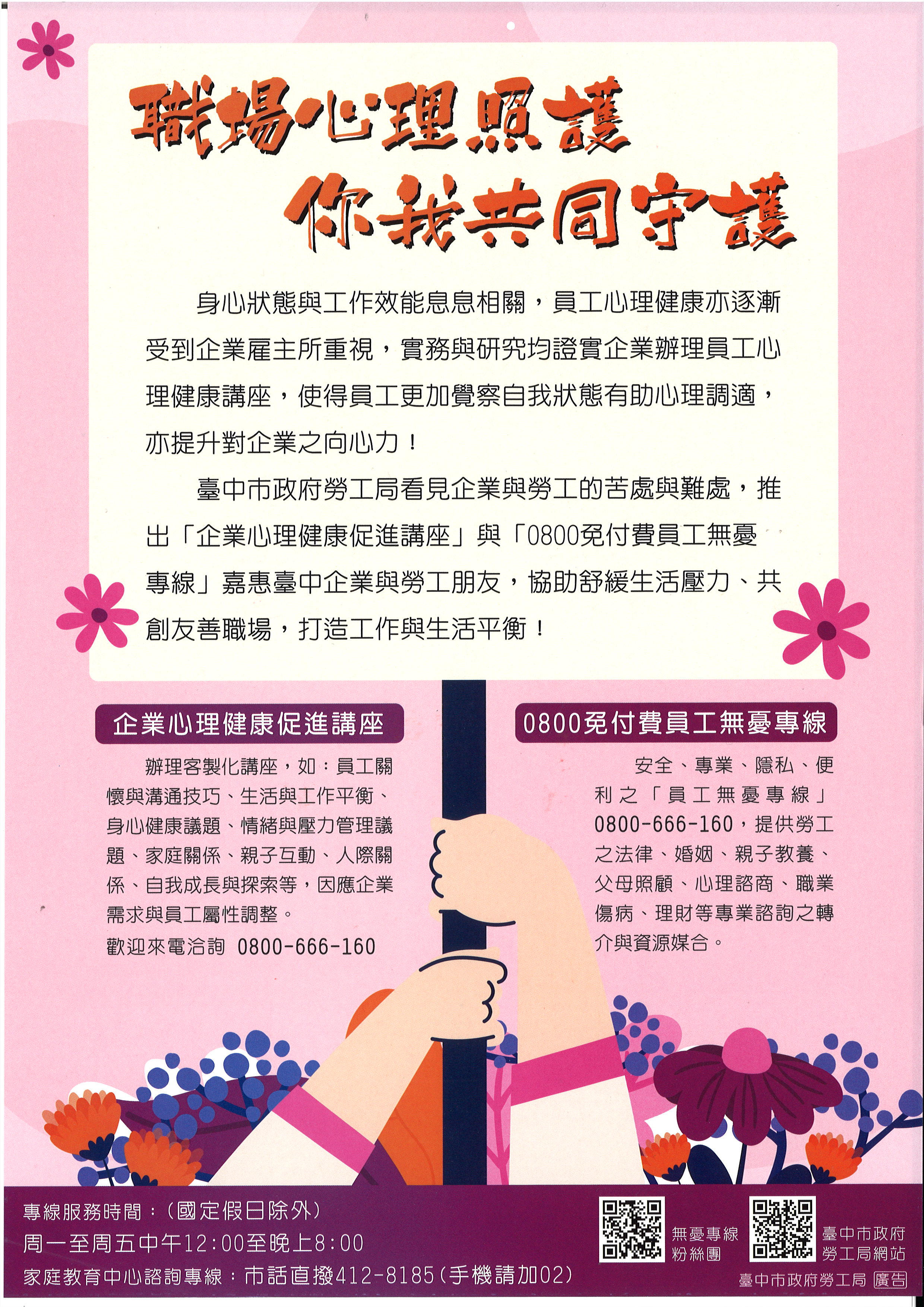 台中市政府勞工局「推動企業與勞工心理照護促進方案」,開辦免付費「員工無憂專線0800-666-160」,由專業人員負責接聽,並協助連結資源,無論是生活上的大小困擾,舉凡婚姻關係、親子教養、長者照顧等皆可來電諮詢,讓專線為勞工朋友分憂解勞,服務時間為週一至週五中午12點至晚上8點(中午不休息),歡迎多加運用。