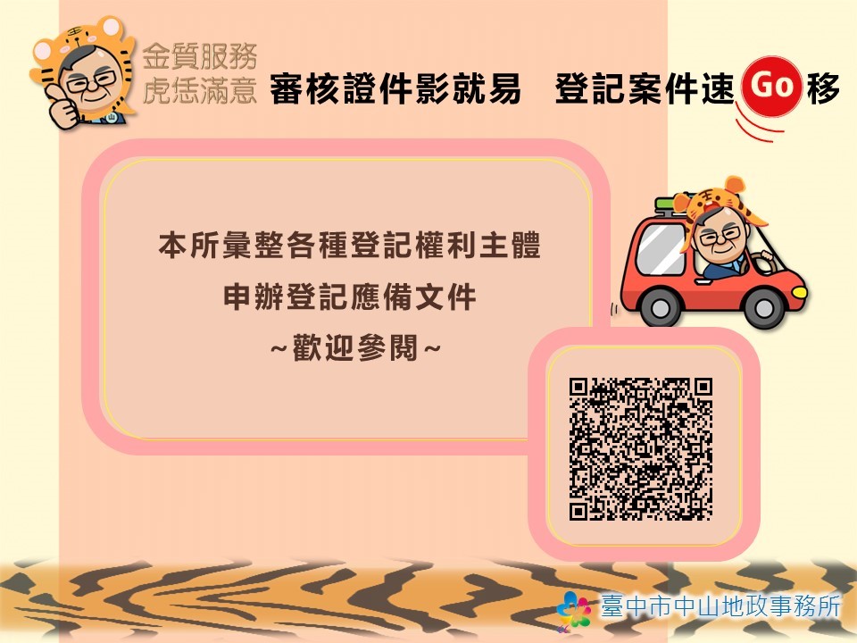 不動產登記攸關人民財產權利,背後牽涉複雜法律規定及嚴謹登記作業流程,申辦登記除了需要符合法令規定外,還需依不同登記原因準備各種應備文件,為便利民眾熟知登記應備文件,台中市中山地政事務所推出「審核證件影就易」創新服務,彙整常見身分證明文件範本供大眾參考。