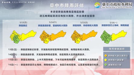 依據中央氣象局資料,明(13)日至516日將迎來首波梅雨鋒面,台中市將達短時強降雨及長時豪雨等級,台中市政府水利局將於明日晚上8時開設三級應變中心,備妥防汛物資全力防災。市長盧秀燕今日主持防疫記者會,除說明今日疫情概況與兒童疫苗施打作業,也提醒市民做好防汛準備,若遇淹水或水利設施災情可撥打1191999通報,市府將立即派員搶修。