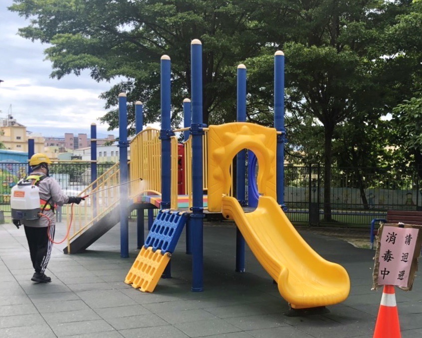 環保局長陳宏益表示,今(15)日是全國兒童安全日,近期國內接連不少兒童確診染疫。自己也是為人父,完全能體會家長擔心自己孩子健康的心情。為降低兒童外出染疫風險,特別將原本「兒童常出入場域清消專案」再升級,除了擴大清消場域外,也叮嚀防疫消毒大隊同仁,一定要將手部常碰觸的地方特別加強清消,包括公園遊具設施的扶手、欄杆或座椅等,公園管理單位也定期翻覆沙坑,以曝曬陽光方式加強消毒,避免細菌滋生。