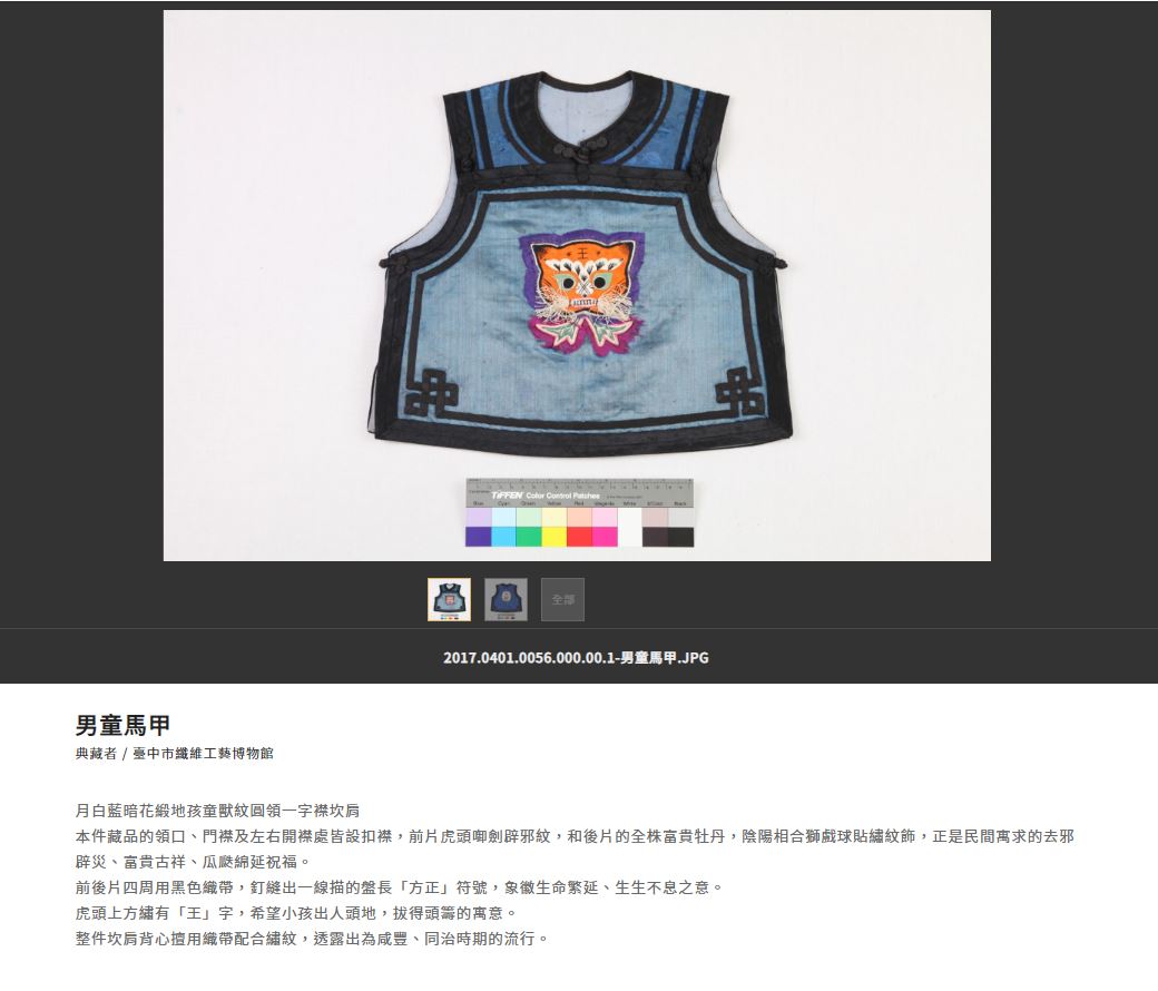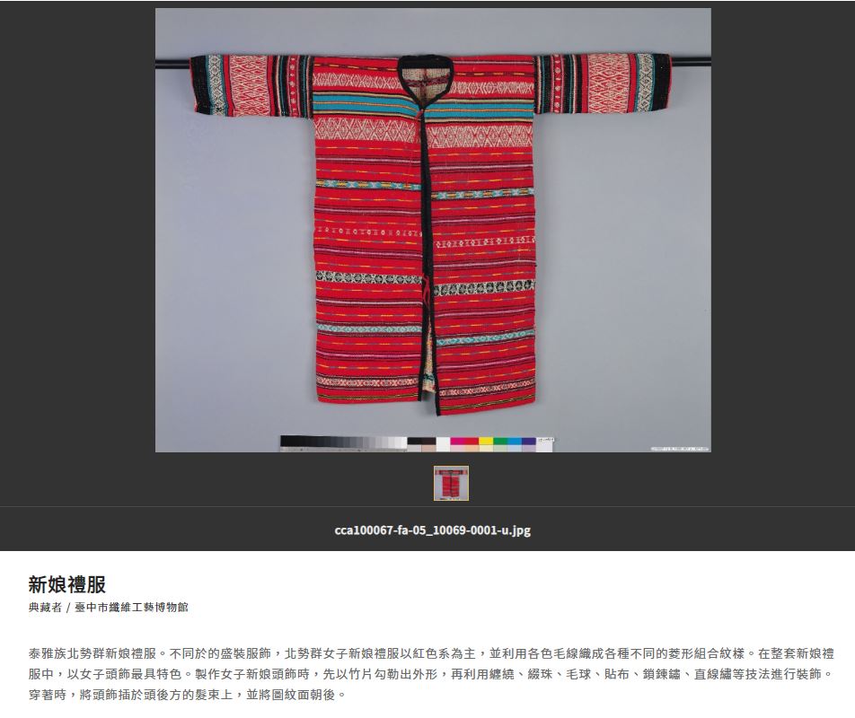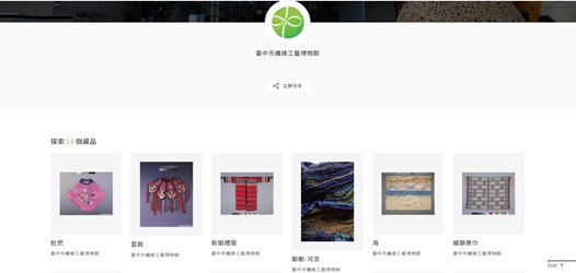 響應518國際博物館日「數位創新及近用的力量」年度主題,台中市纖維工藝展演中心特選58件典藏品,加入中央研究院數位文化中心的「開放博物館」平台,從傳統各族群編織品,如漢人的肚兜、貴州苗族的盛裝衣、排灣族的織巾,到舒淇曾代言的藺草編織禮服等,皆於平台上開放,市府文化局表示,民眾可隨點隨看不受時空限制,只要有3C設備與網路,處處都是博物館!