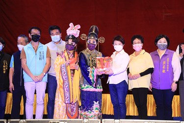 盧市長表示,爲慶祝台中市媽祖文化節,台中市政府在各地舉行相關藝文活動,今天在梧棲朝元宮邀請到全國著名的明華園劇團演出,希望疫情期間讓民眾放鬆心情,也藉此宣導民眾落實防疫,地方一切平安。
