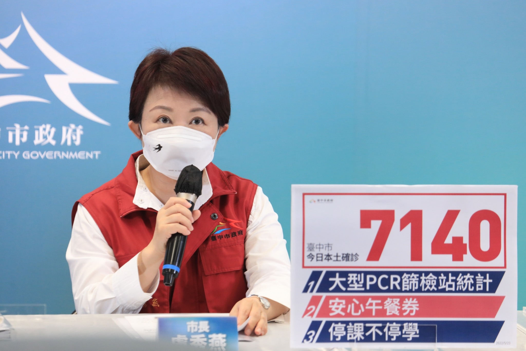 全國今(23)日本土確診新增66247例,台中市本土個案新增7140例。市長盧秀燕今日於防疫線上記者會表示,全國案例數比昨日少許多,可能是假日效應,所以整體數據減少,提醒大家仍不要掉以輕心,戴好口罩,保持社交距離,落實防疫措施。