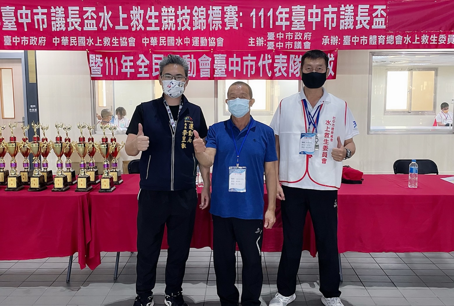 運動局長李昱叡、中華民國水上救生協會理事長廖茂為、台中市體育總會水上救生委員會主委薛烱東一起為選手加油打氣。