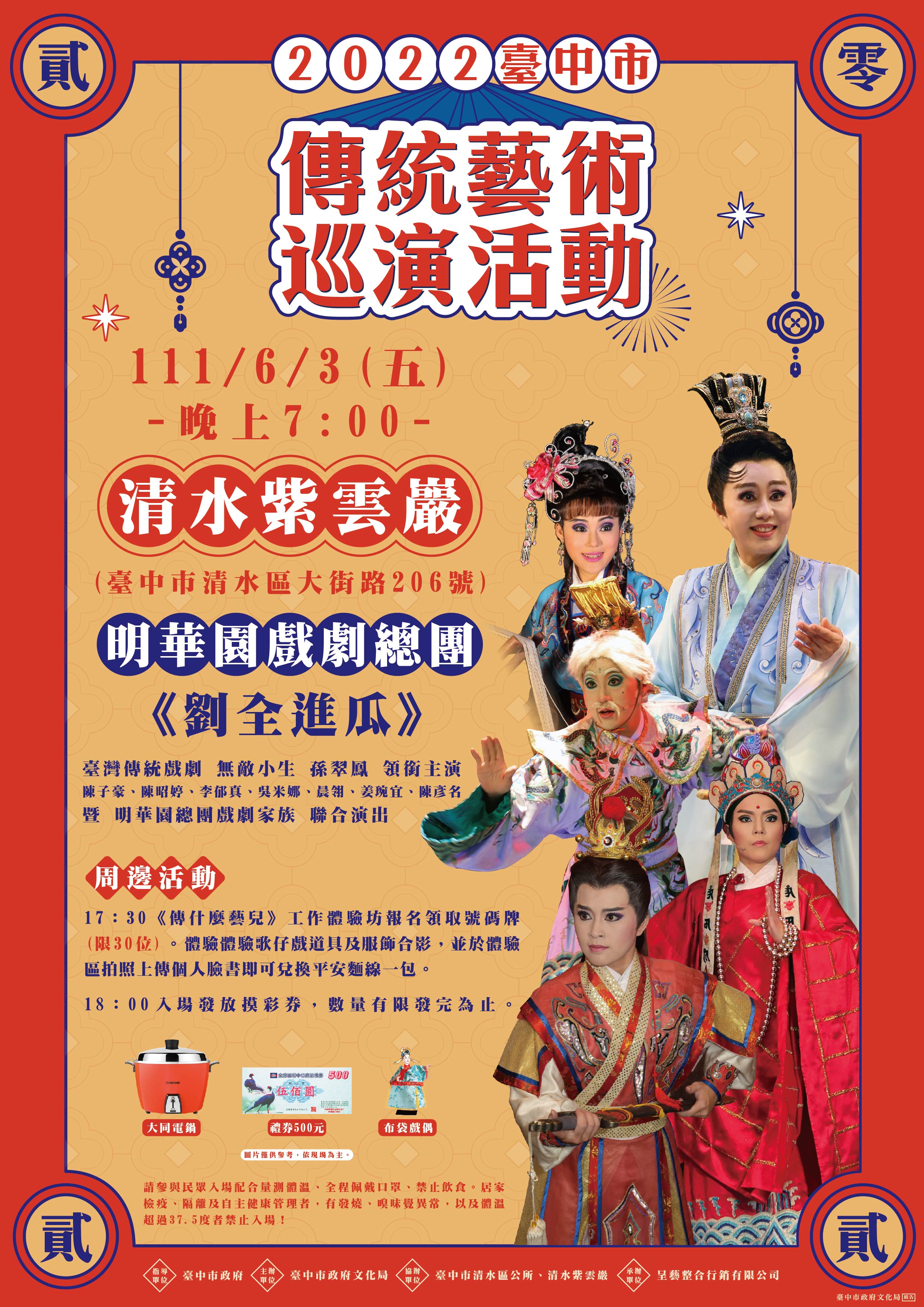 台中市政府文化局舉辦2022「台中市傳統藝術巡演」系列活動,將在端午節6月3日晚上7時於清水紫雲巖邀請明華園戲劇總團帶來經典戲曲《劉全進瓜》,現場還有戲服體驗及摸彩活動,歡迎民眾在遵守防疫規定下,把握機會一起看好戲、抽大獎!