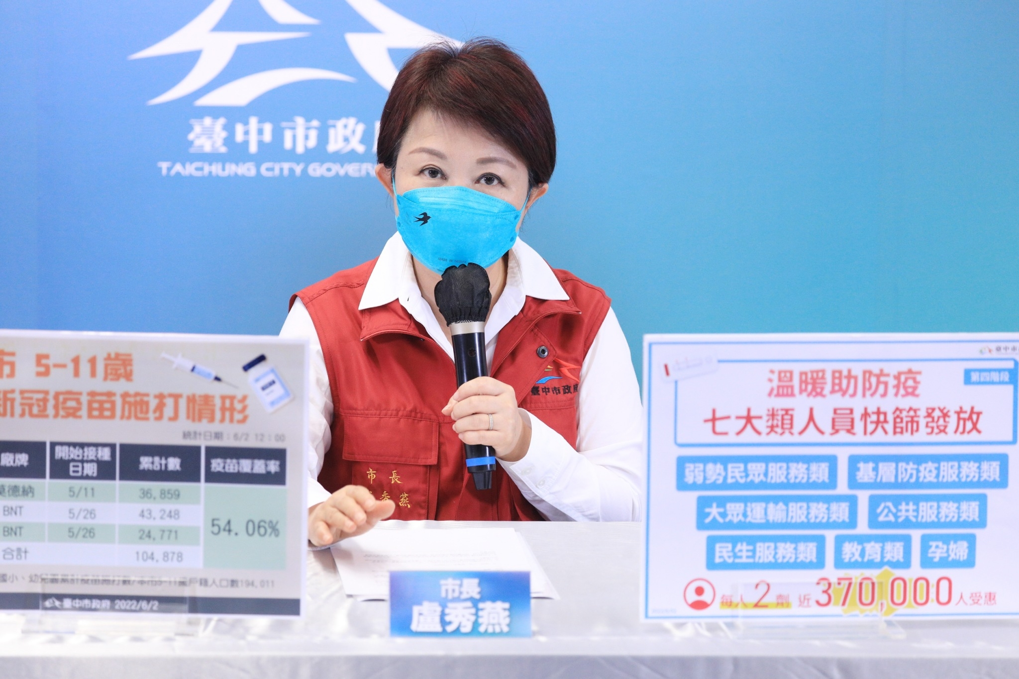 台灣疫情嚴峻,確診數未見緩解,台中市長盧秀燕今(2)日宣布「溫暖助防疫」進入第四階段,將針對高風險、接觸群眾多等的第一線人員,加發快篩試劑,可分成七類,包含「弱勢民眾服務類」、「教育類」、「基層防疫服務類」、「孕婦」、「民生服務類」、「大眾運輸服務類」、「公共服務類」等加發試劑,每人兩劑,預計有近37萬人受惠,將發出近75萬劑快篩。累計「溫暖助防疫」四個階段超過71萬人受惠,將發出140萬劑快篩,幫助其在工作與生活中多分保障,也讓民眾安心。
