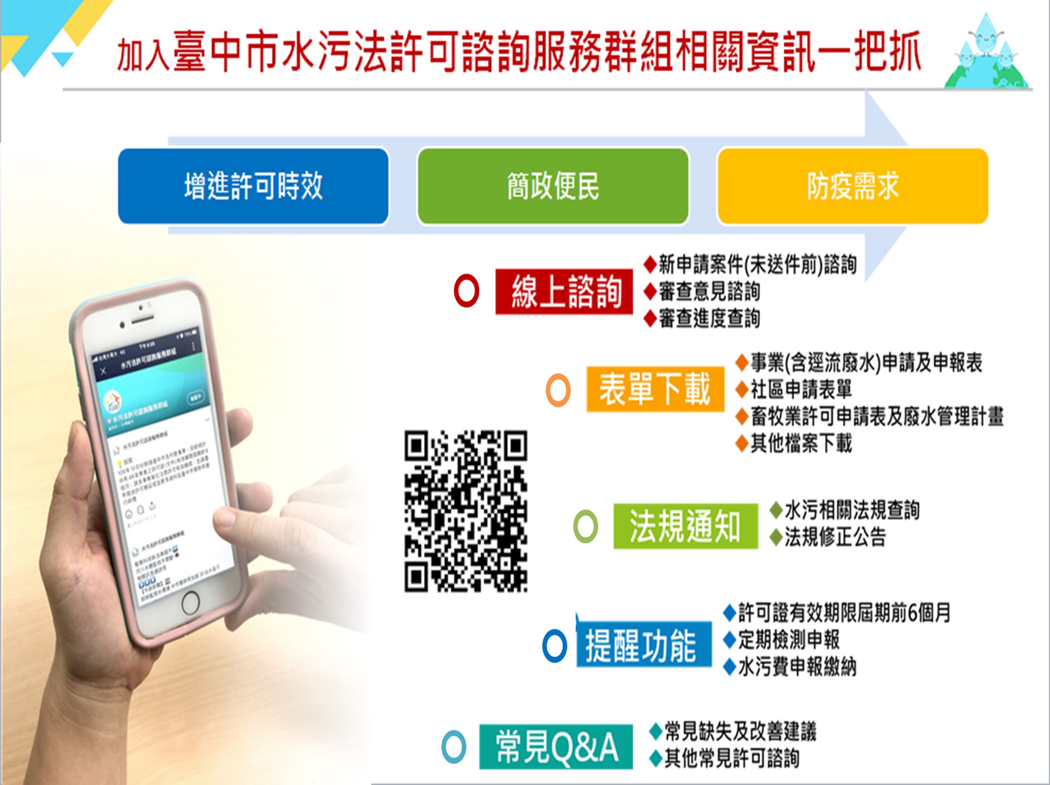 台中市政府環保局為提供工廠業者快捷便利的行動化諮詢服務,109年起陸續於LINE APP成立「台中市水污法許可諮詢服務群組」、「台中市政府固定污染源管制及空氣品質維護」,提供事業即時暸解許可申請流程、查詢許可審查進度、諮詢許可審查意見,對於審查意見有疑義者也可透過LINE諮詢,免出門、免臨櫃、免電話等待,享有專人服務解惑,必要時也可預約面談,減少退補件次數,縮短審查時間,提升服務品質。