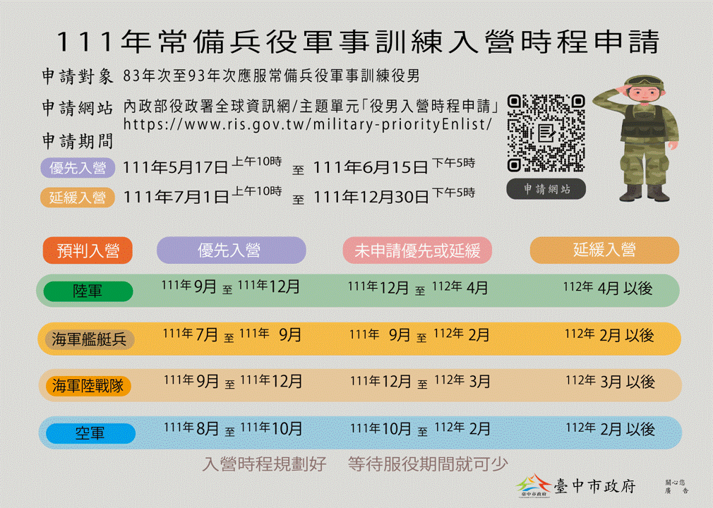 為縮短役男等待入營時間,83年次以後出生的常備役體位役男至6月15日下午5時前可至內政部役政署網站「役男入營時程申請系統」線上申請優先入營;有延緩入營需求者,則於7月1日上午10時至12月30日下午5時受理申請。民政局長吳世瑋表示,為紓緩應屆畢業役男耗時等候入營,或有參加國家考試、技職訓練役男需延緩入營,役政署提供111年應屆畢業役男入營時程多元方案,協助役男完成人生規劃,呼籲有意願的役男儘速提出申請。