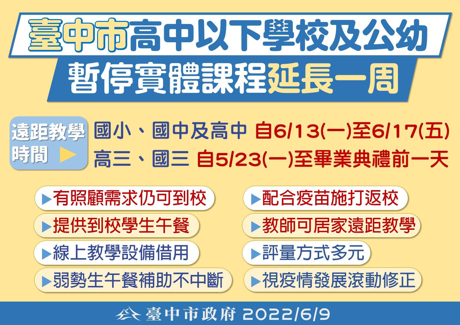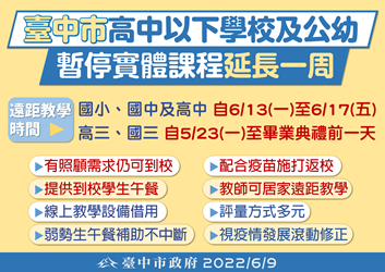 台中市高中以下學校原訂暫停實體課程至610日止,改採遠距教學,公幼部分暫停實體教學,私幼則開放與家長協商後自行決定停課與否。因台中疫情仍處高原期,台中市政府教育局聽取八個家長團體意見後,考量到孩童的防護力,市長盧秀燕今(9)日再宣布,「停課不停學」措施再延一週,從61317日止仍暫停實體教學,後續將視疫情發展再滾動檢討。