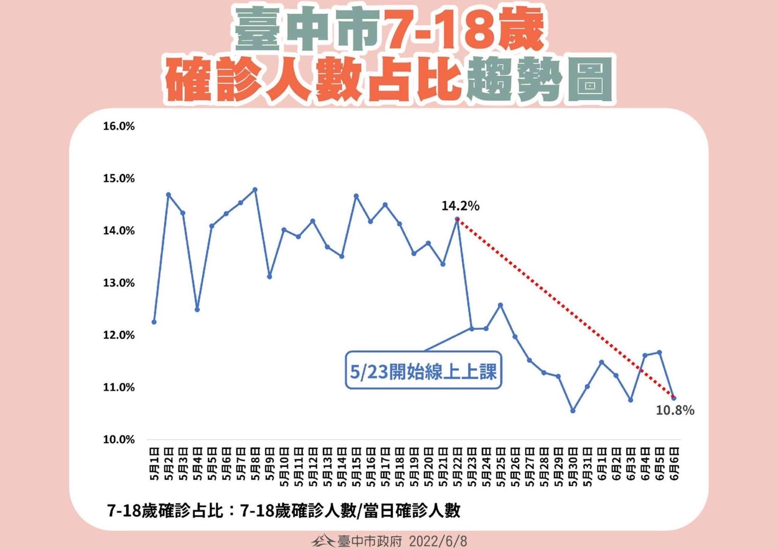 盧市長說明,台中市高中以下暫停實體課程,改採線上教學是從523日開始,718歲的確診人數占比曲線,呈現往下走的趨勢,即便台中近幾天單日確診數上萬,但718歲的確診人數占比曲線沒有上升,顯示市府「停課不停學」的措施,對避免孩童在校群聚而確診有一定程度的幫助。