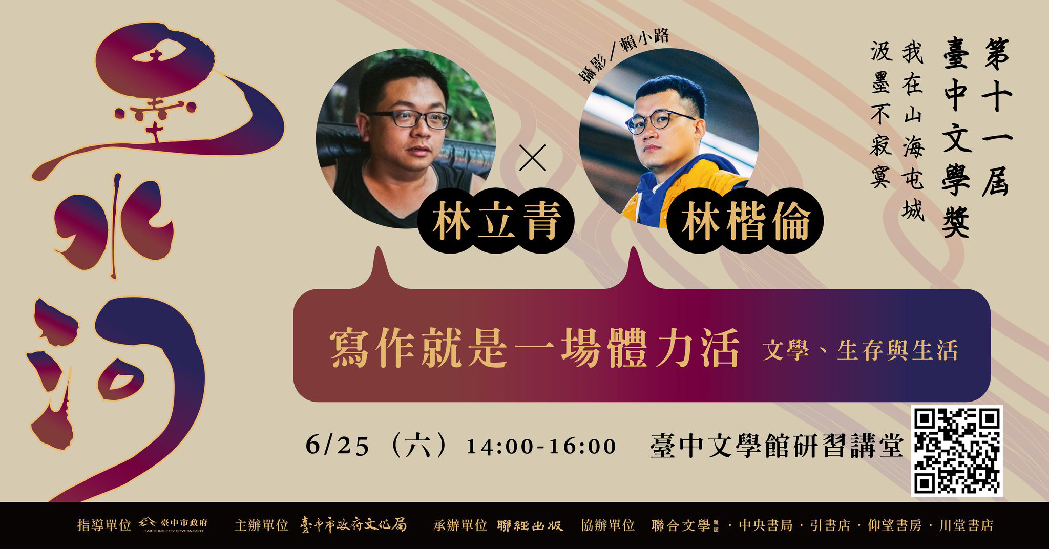 台中市政府文化局主辦第十一屆台中文學獎,第一場推廣講座將於625日下午2時在台中文學館研習講堂登場,邀請兩位職人作家林立青和林楷倫以「寫作就是一場體力活—文學、生存與生活」為題,和讀者分享他們獨特的人生經歷,歡迎民眾前往參與兩位身兼「工人」和「魚販」作家的精采對話。
