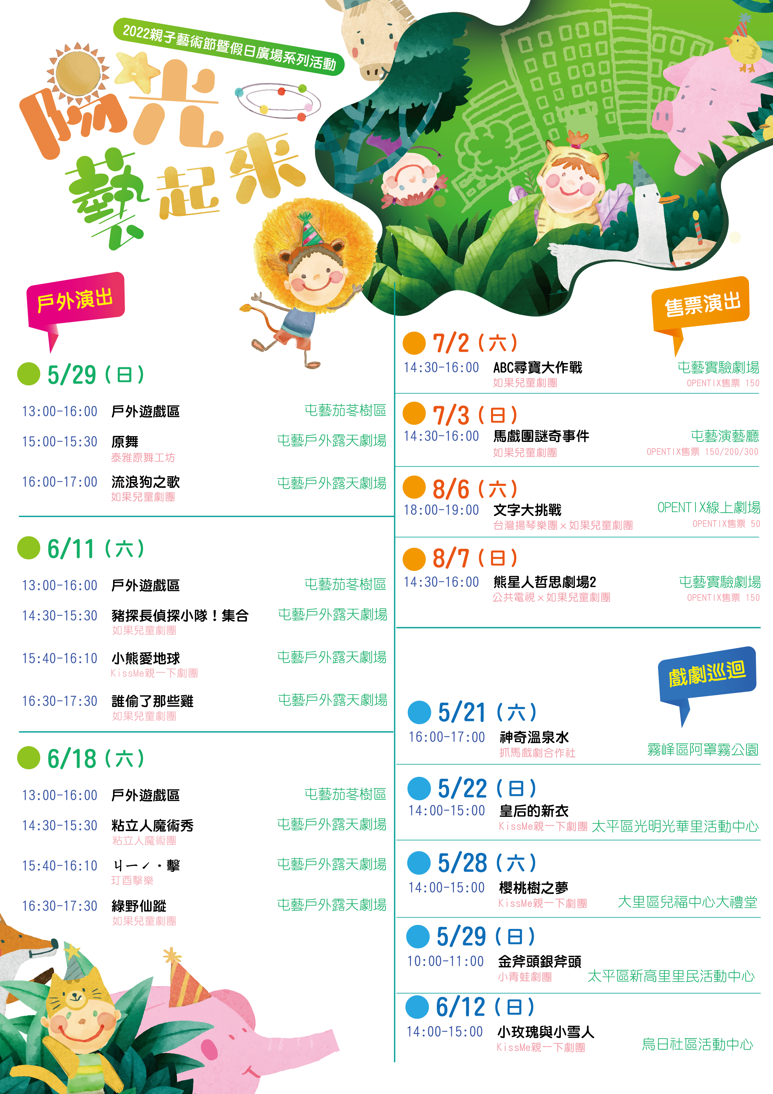 相關節目場次及售票資訊可至屯藝中心官網 ( www.ttdac.taichung.gov.tw )OPENTIX售票系統( https://reurl.cc/loljdQ )查詢。民眾參與活動時請配合量測體溫、手部酒精消毒、全程佩戴口罩及保持安全社交距離,並鼓勵大家完成第三劑疫苗注射及手機下載「台灣社交距離」APP,安心參與各項活動。(6/19*13)*文化局