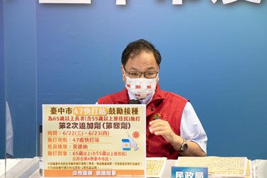 令狐副市長指出,中南部疫情仍處於高峰,為提升城市防護力及個人保護力,市府將在本週三、四(6月22、23日)啟動47處快打站,為設籍台中市65歲以上長者、55歲以上原住民施打第二次追加劑(第四劑)莫德納疫苗,預估全市約17萬人可施打,由公所統一造冊、發放疫苗接種通知單。
