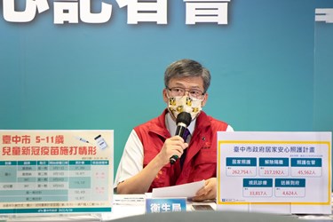 衛生局長曾梓展表示,中央公告BNT兒童疫苗今到貨,預計6月22日分送到地方,市府預計6月23日將開放醫療院所預約施打;此外,統計台中5至11歲兒童疫苗施打情形,接種BNT第一劑自5月26日至6月20日,累計施打11萬5131人;接種莫德納第一劑自5月11日至6月20日,累計施打3萬7289人。統計台中市5至11歲第一劑疫苗共接種15萬2420人,第一劑疫苗涵蓋率78.56%,第二劑涵蓋率為5.61%,其中第二劑涵蓋率排名六都第一。