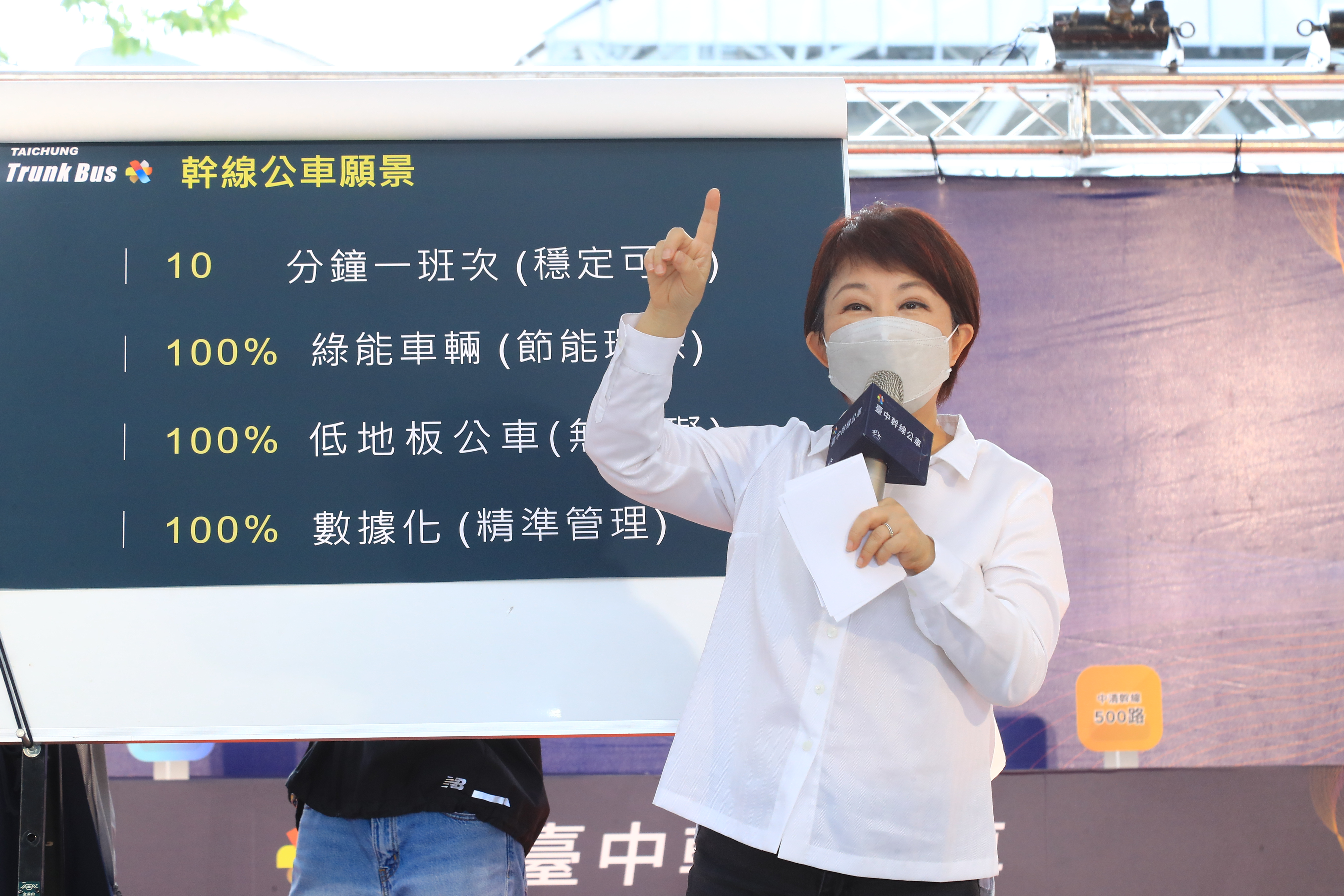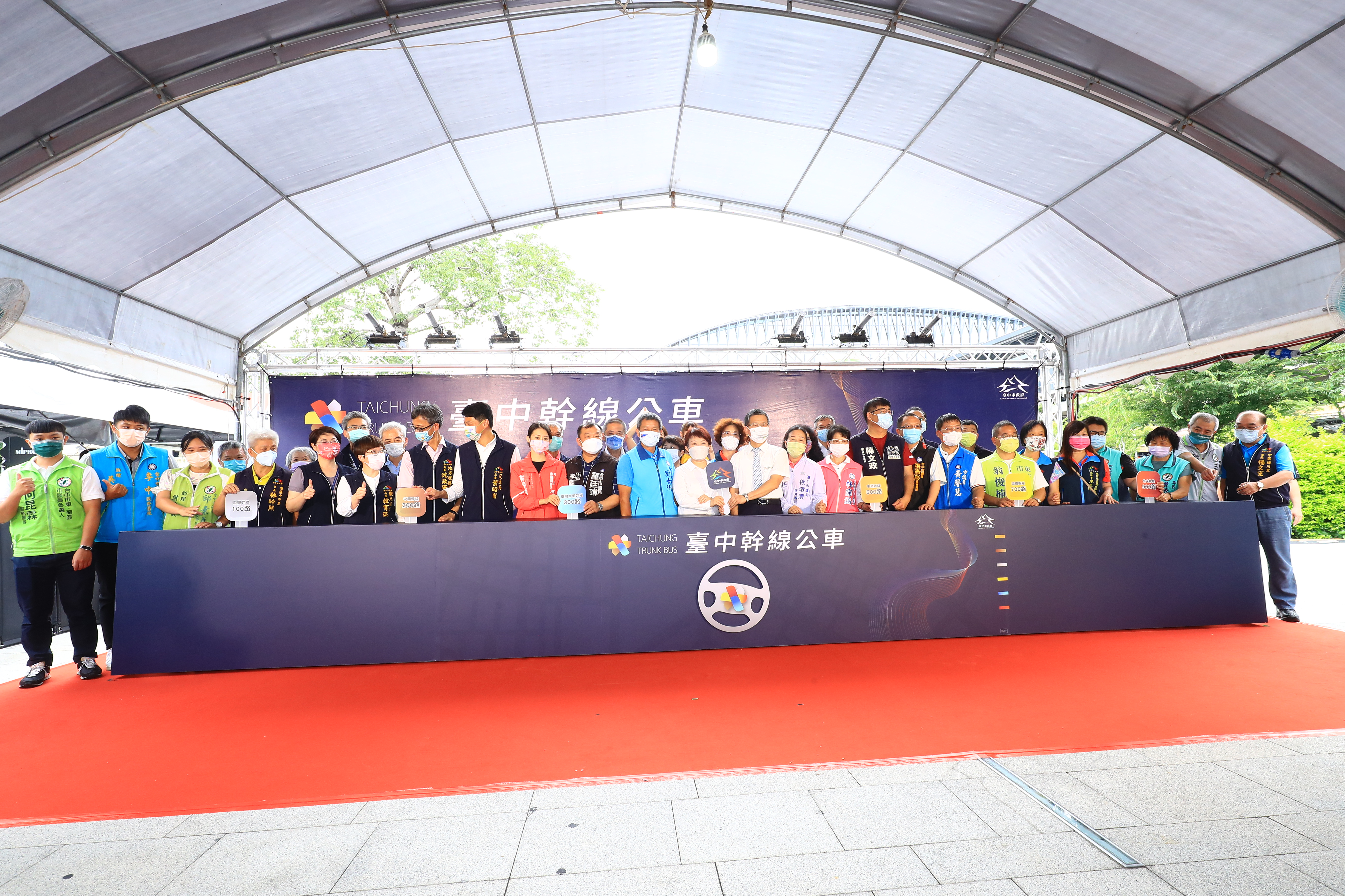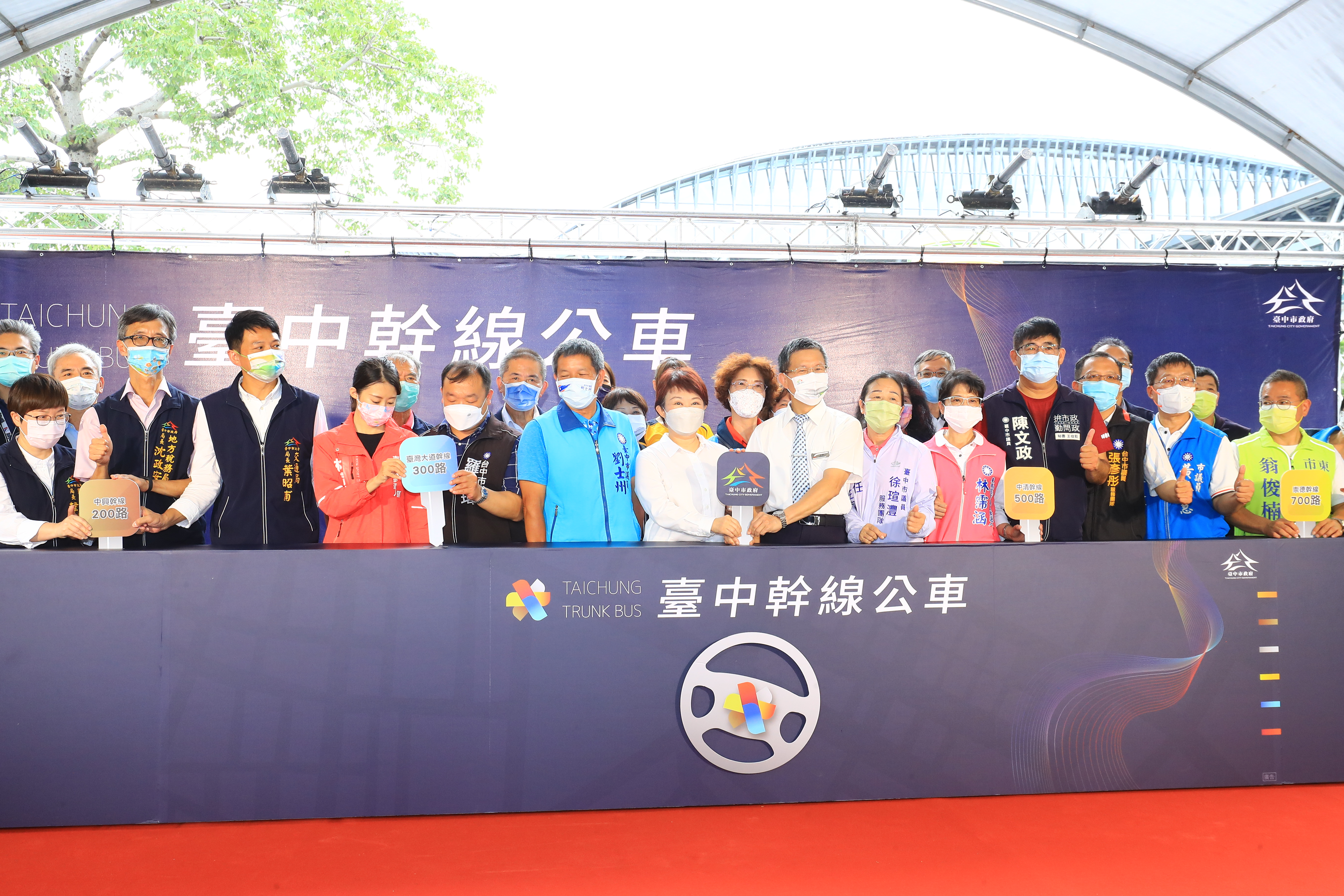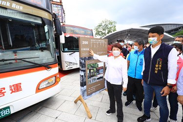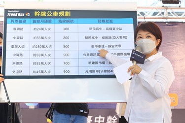 盧市長提到,台中電動公車數量全國最多,六大幹線公車番號分別為100200300500700900,因應搭乘人數提高班次,尖峰10分鐘一班,離峰15分鐘一班,均採低底盤無障礙公車,另以6個顏色加強識別系統,站牌、候車亭等各項設施均統一色系,讓大家容易辨識。