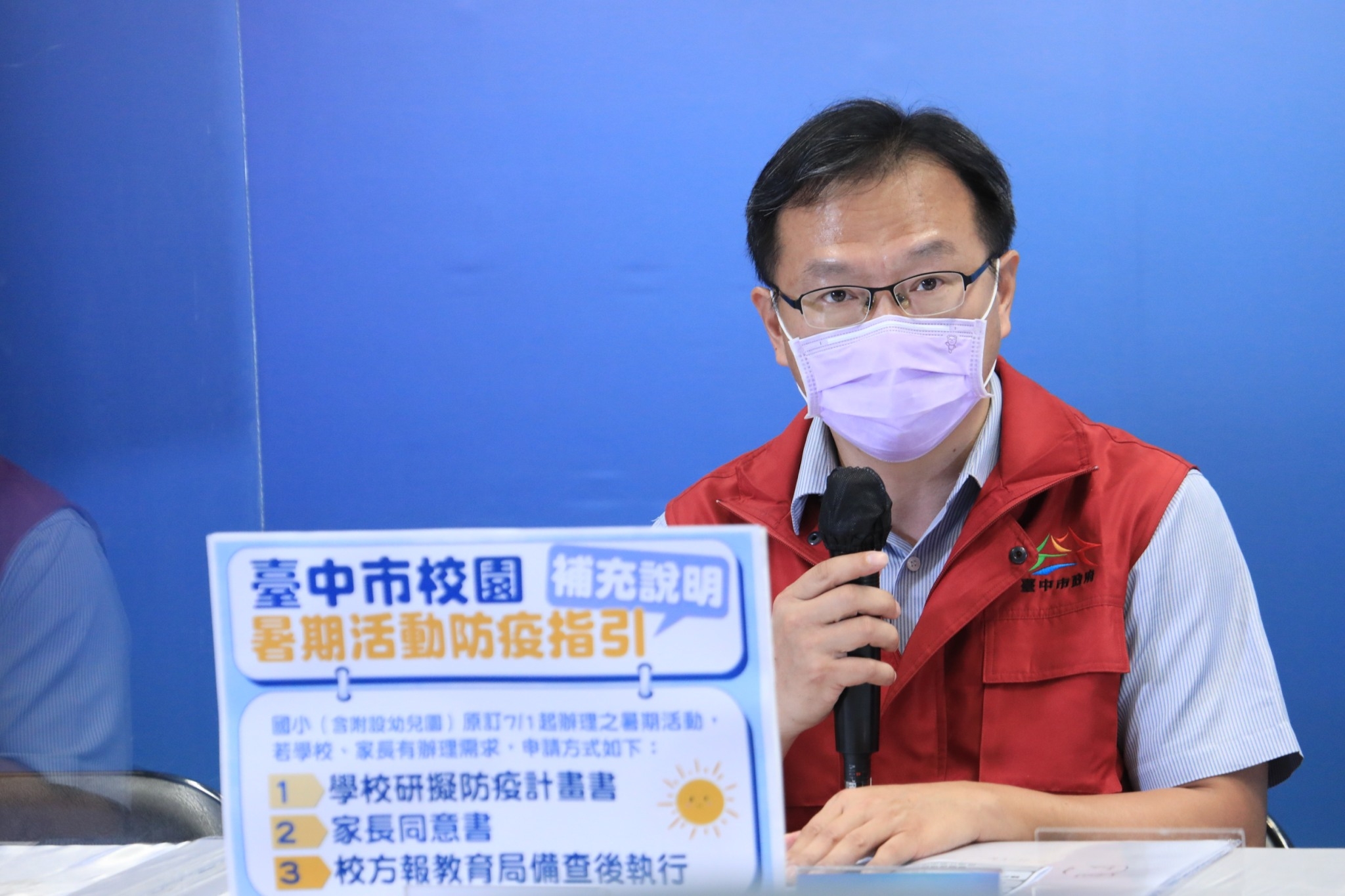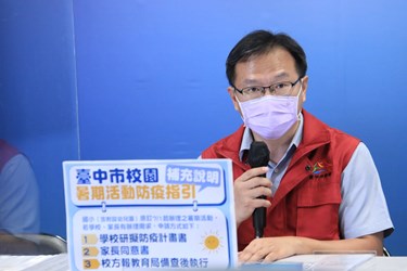 另外,有關台中市校園暑期活動防疫指引,教育局主秘郭明洲補充說明,國小往年暑假7月起會舉辦如身心障礙學生暑期育樂營、課後照顧班、學習輔助、夏日樂學或各類型學生團隊活動訓練,時間可能是半天或整天,若學校及家長有舉辦需求,可由學校研擬防疫計畫書,並出具家長同意書,報教育局備查後即可執行。