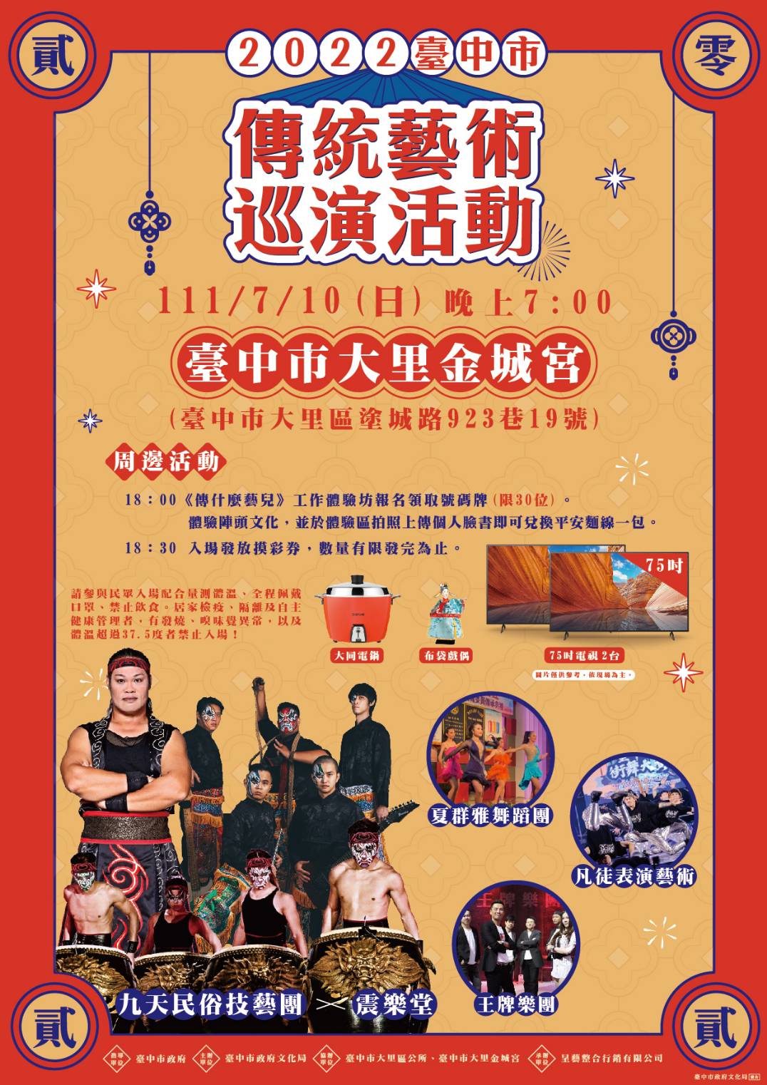 台中市政府文化局今(10)晚將在大里區金城宮舉辦「2022台中市傳統藝術巡演活動」,邀請文化部優良扶植團隊「九天民俗技藝團」與台中市在地團隊「震樂堂」同台演出搖滾廟會,精彩的跨界合作將帶給現場觀眾沸騰的視聽覺藝文饗宴。市長盧秀燕將到場支持傳統藝術,並頒贈「保境佑民」匾額,感謝大里金城宮長年對地方的貢獻。