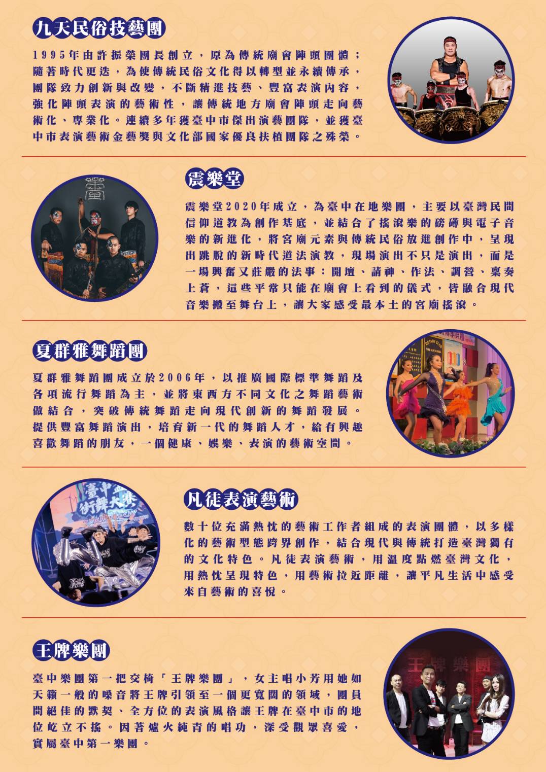 文化局表示,盧市長上任後重視傳統藝術的傳承與推廣,自109年起邀請全國及台中市優質演藝團隊,將傳統藝術節活動推廣至台中市各區巡迴演出,讓市民可以就近欣賞精采節目。近兩年演藝團隊受到疫情衝擊,文化局也積極提供藝文紓困,市府自前年至去年陸續辦理藝文創作及演出的紓困徵件,核定總金額逾1,800萬元,幫助團隊在疫情過後重新綻放蓄積的能量。今日除有九天民俗技藝團及震樂堂帶來跨界合作的《搖滾廟會》,還有在地團隊-夏群雅舞蹈團、凡徒表演藝術、王牌樂團等多元節目內容,不容錯過。