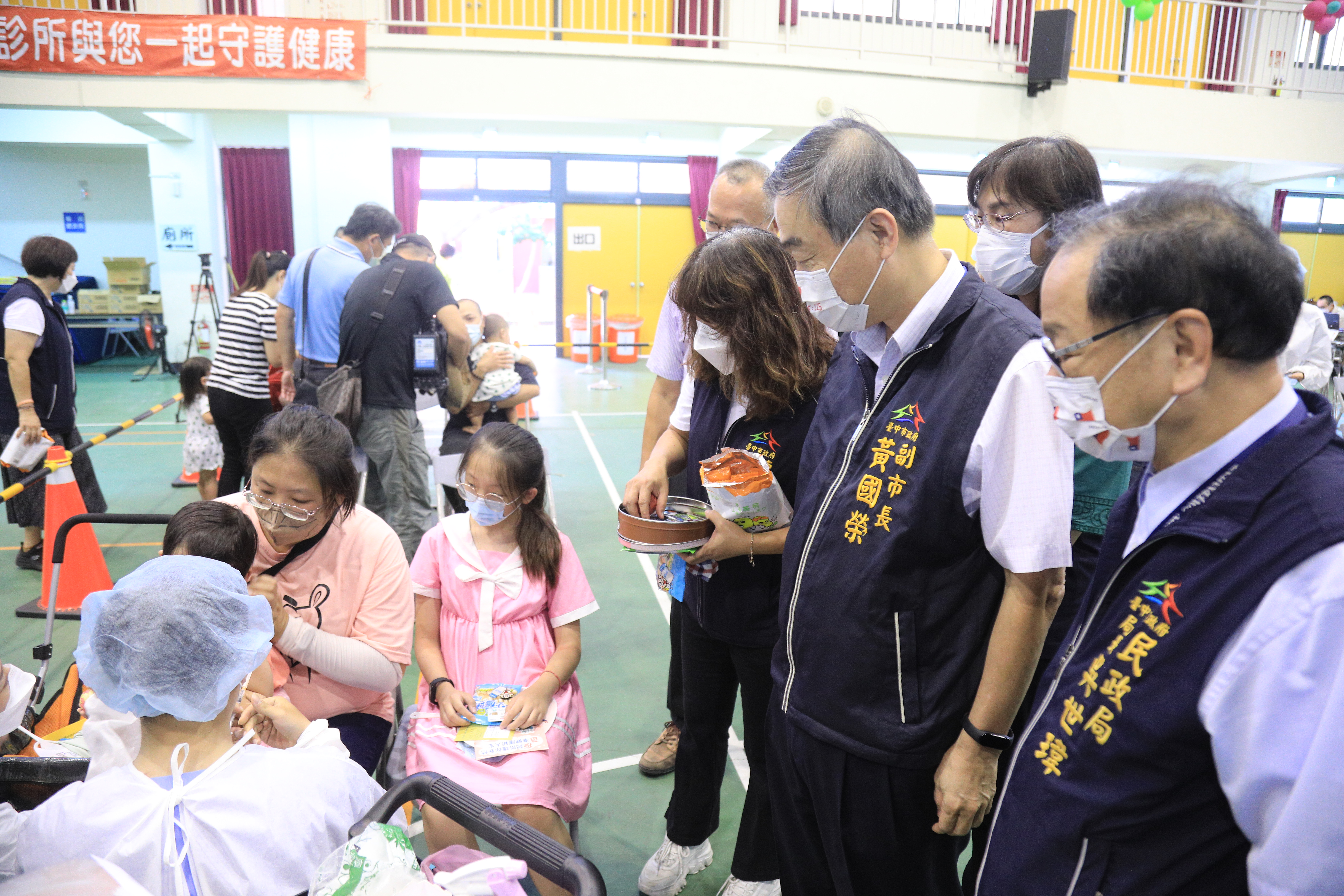 提升嬰幼兒防護力!台中市政府採合約院所、衛生所、幼兒園入園,以及啟動嬰幼兒快打站「多管齊下」,提供6個月以上未滿6歲嬰幼兒接種莫德納疫苗第一劑。今(22)日起連續四天開設46處嬰幼兒快打站為幼童接種,副市長黃國榮前往東區進德國小關心接種情形表示,現場動線安排及各項友善親子措施均準備充分,秩序良好,尤其嬰幼兒注射後,難免哭鬧,現場醫護與工作人員,馬上遞上「琳瑯滿目的玩具和點心」,轉移孩子的注意力,也讓現場家長覺得逗趣。黃副市長表示,感謝工作人員辛勞,也呼籲家長帶小朋友來施打,提升防護力。
