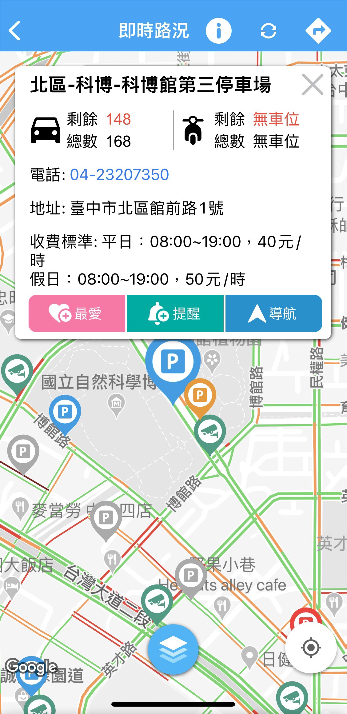 出遊如何一路暢通?交通局建議,民眾出遊時可利用台中交通網APP查詢路況與目的地停車場資訊,除可快速繞開壅塞路段,也不用煩惱找停車位;也可查詢iBike、台鐵、高鐵時刻表等交通資訊,歡迎民眾踴躍下載。台中交通網除提供便利停車查詢服務,還能輕鬆查詢景點周邊有哪些停車場,與即時剩餘車位資訊,並提供導航功能,一鍵按下,輕鬆抵達停車場。