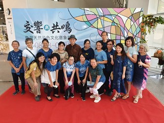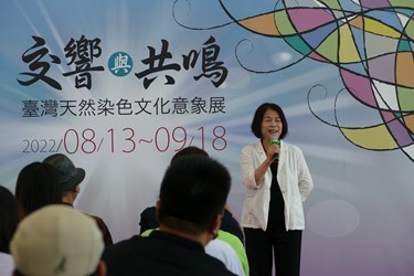陳老師說明,「交響與共鳴」策展理念「色彩的交響.情感的共鳴」,是將對於色彩的共同記憶構築出專屬台灣的色彩文化意象,進而成為台灣發展染色工藝的重要資料庫。展區分成「主題意象」、「色系演繹」、「節氣風情」、「染纈應用」四展區,透過介紹、分類、解析與應用等不同面向,提供台灣染色工藝界更多運用題材,提升染色工藝水平,使色彩使用具有天然、環保的特性,讓人類與環境都能和平共存、永續發展。