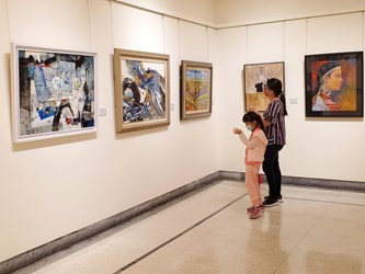 文化局也說,今年參展藝術家中,最年長的是版畫類楊允模老師高齡94歲,他特別提供〈虎視眈眈〉版畫作品展出,呼應台中市藝術家虎虎生風;同樣以生肖虎為創作主題,又是24年全勤參展的工藝類陳春明老師作品〈虎你歡喜〉,以竹頭雕刻可愛又童趣的小老虎,令人心生歡喜;連續參展24年、年逾80歲的雕塑類陳金典老師,每年都提供最新作品參展,這次展出石雕作品〈親情〉高65公分、超過150公斤,刻劃貓頭鷹家族爸爸穩穩撐持,媽媽雙手環繞二個小孩站在爸爸肩上,象徵著藝術薪火相傳;今年88歲的膠彩類藝術家趙宗冠老師也是年年以全新作品展出。
