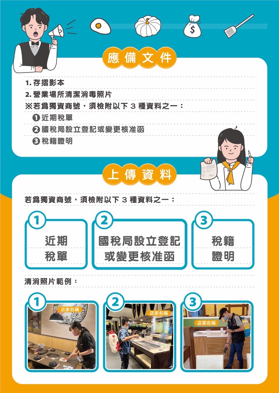 經發局說明,申請平台操作簡易,輸入統一編號後,檢視、填寫基本資訊,並附上匯款帳戶影本、營業場所清潔消毒照片以及相關稅籍佐證資料即可。其中清消照片,無須委託專業清潔公司,可請員工於營業場所內拍攝清潔消毒中的照片,如清洗店面設備、擦拭桌椅、酒精消毒設備等可辨識清消中即可,另近期有部分清潔業者及代辦業者聲稱,市府授權委託代餐飲業者申請,並抽取服務費的情事,市府澄清申請程序已十分簡便,無委託或授權任何民間業者以收取服務費方式代為申請。