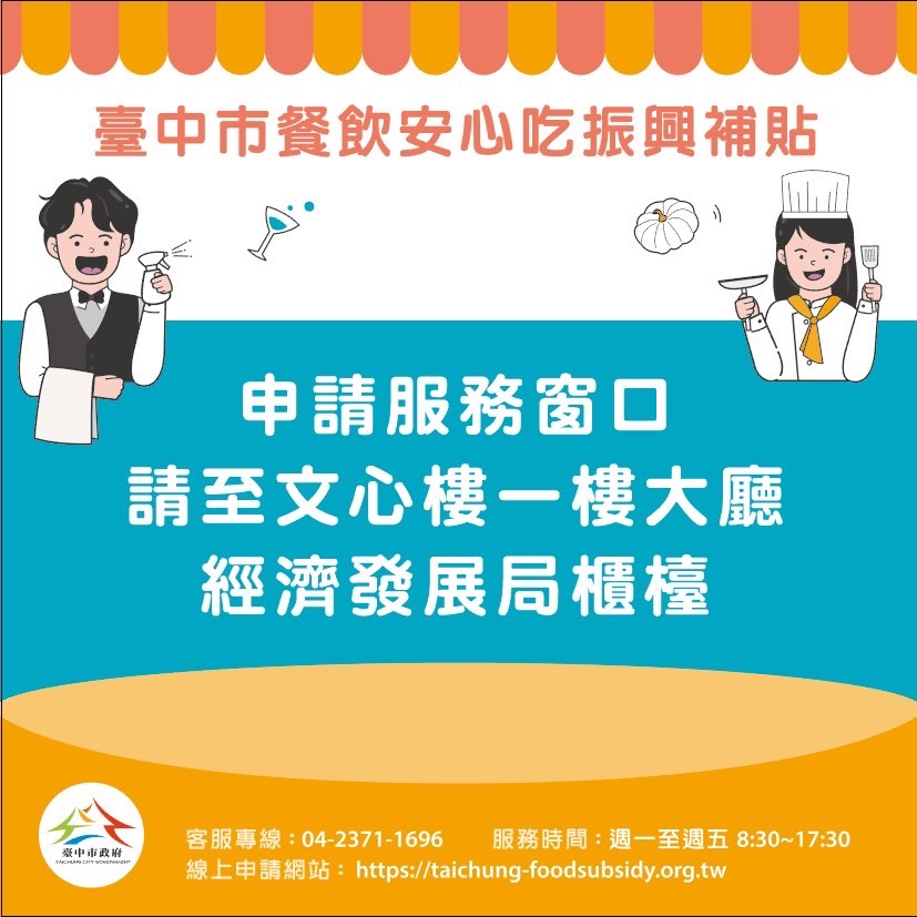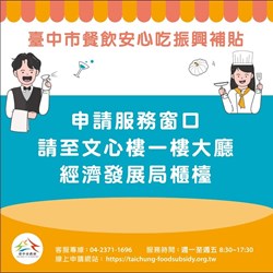 台中市政府振興受疫情影響的餐飲業,辦理「台中市餐飲安心吃振興補貼」,以線上申請方式補貼清消費用5,000元,現為擴大服務、輔導民眾操作,自明(5)日起,將於市府台灣大道市政大樓文心樓1樓大廳,設立服務窗口協助業者申請與諮詢,歡迎今年7月15日前取得稅籍,包含「免開發票」及「開立發票」的餐飲業者於申請期間(至今年9月14日止)多加利用。