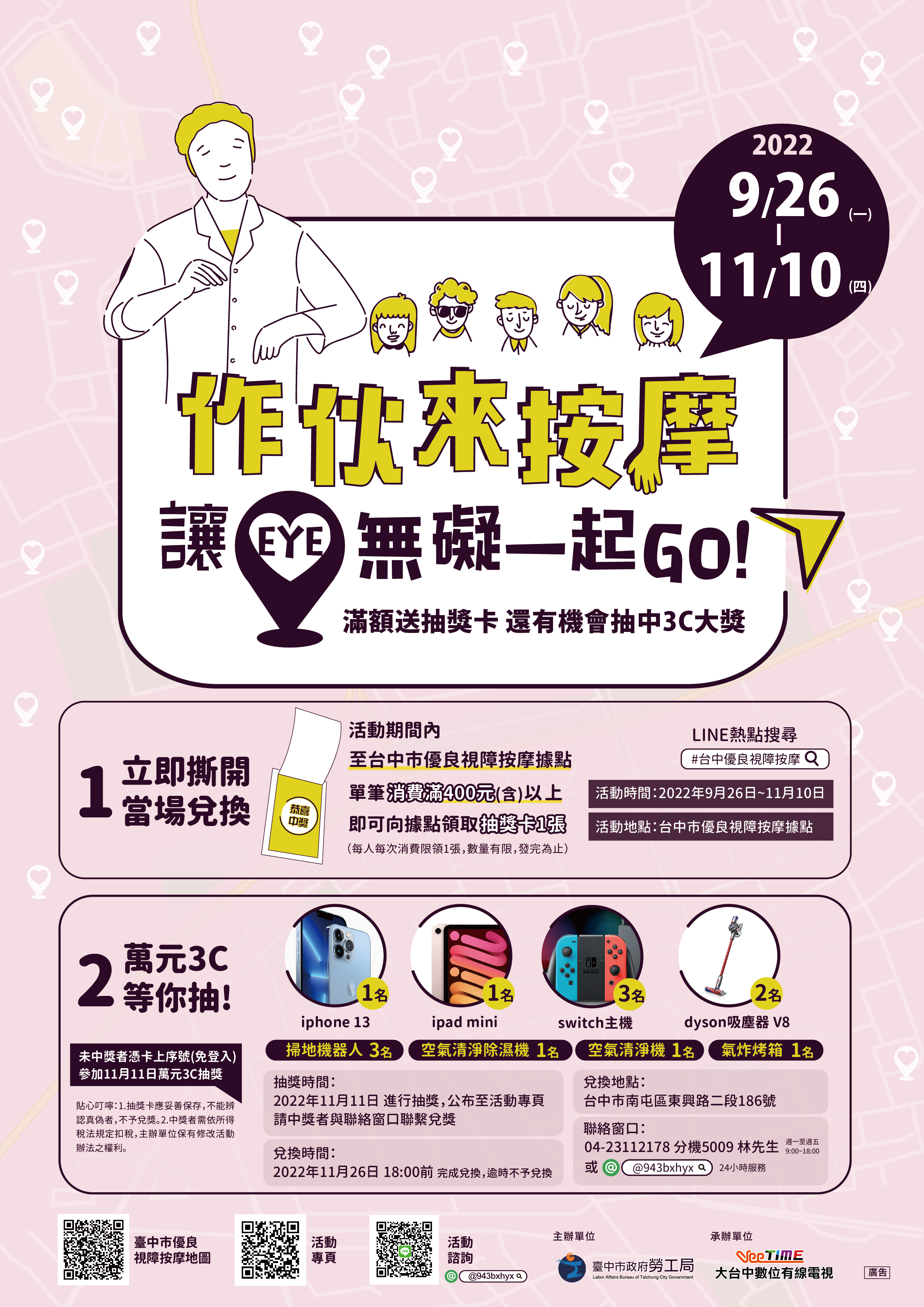 111年度台中市優良視障按摩據點行銷活動開跑!自即日起至1110日止,民眾只要到「台中市優良視障按摩據點」單筆消費滿400元以上,就可獲得抽獎卡1張,立即撕開、當場兌換,沒中還有機會參加抽獎,抽iPhone13iPad miniSwitchDyson無線吸塵器等多項大獎,中獎率高,數量有限發完為止,快找親朋好友作伙來按摩,健康、紓壓順便抽萬元3C