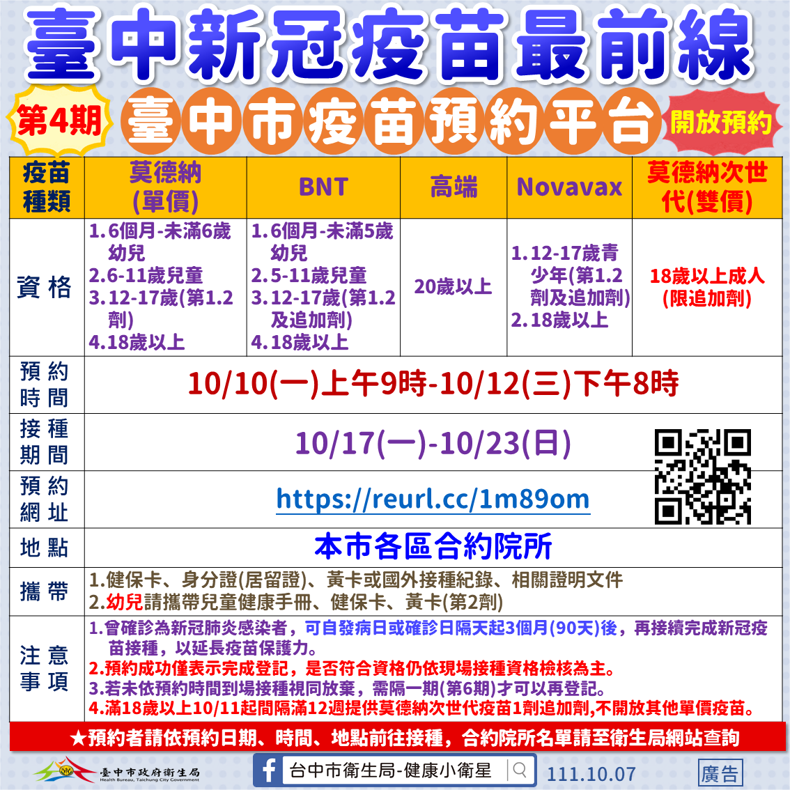 台中市為簡化新冠疫苗接種預約作業,疫苗預約平台第四期預約自今(10)日上午9時至12日下午8時止,開放線上預約。此期接種日期為10月17日至23日,開放莫德納(幼兒、兒童、成人)、BNT(幼兒、兒童、成人)、高端、Novavax及莫德納次世代等疫苗等共4萬7,373個名額,呼籲符合接種資格民眾儘速至台中市疫苗預約平台(https://vaccine.taichung.gov.tw/Vaccine/Menu)預約接種。