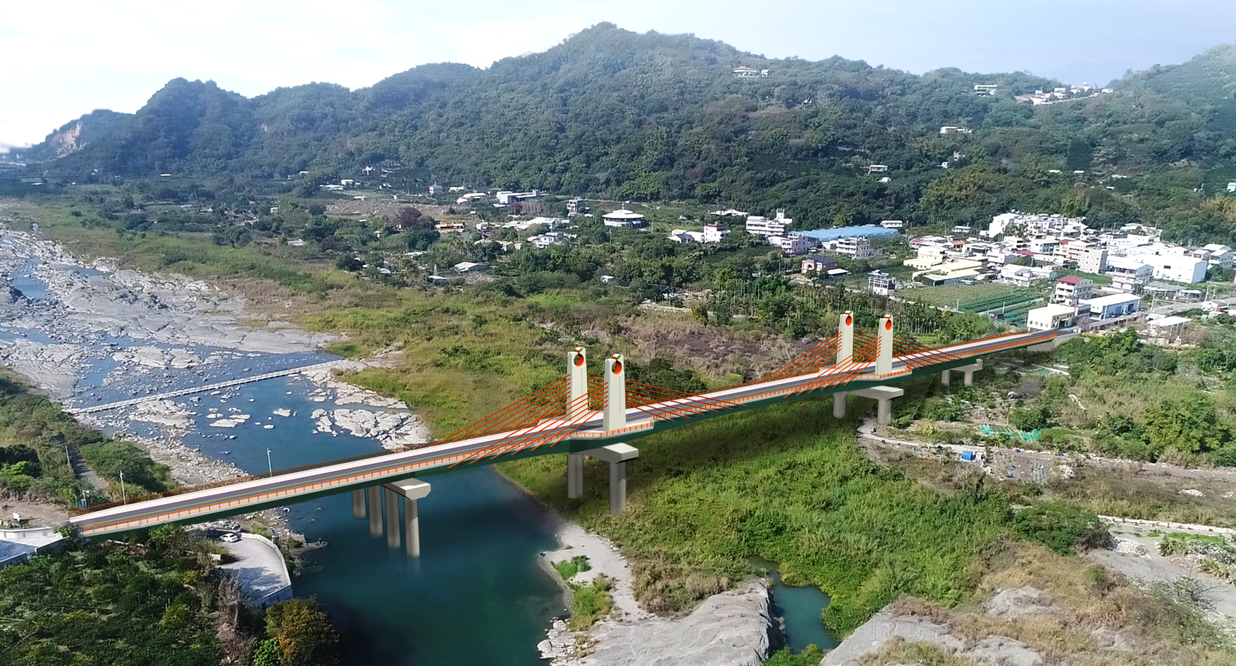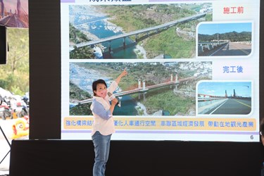 陳局長補充,改建新橋將以脊背橋形式重現,採用大跨距設計跨越車籠埔斷層,並加大支承座來防止斷層錯動造成橋梁墜落,全面提升橋梁安全性;此外,也在橋塔頂端融入地方農產元素、設置吊索及橋塔投光燈等,形塑地方自明性與亮點工程,完工後除串聯東勢、豐原及石岡等區域,未來也可整合后豐鐵馬道、石岡水壩、九二一地震園區等周邊景點,連結遊憩區域,提升當地觀光人潮。