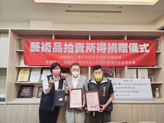 台中市工商發展投資策進會和跨業交流會經營者組今(26)日在台中市宏恩基金會辦理藝術品拍賣會所得捐贈儀式,由宏恩基金會董事長吳子鈞醫生代表受贈。工策會總幹事黃于珊表示,疫情期間慈善團體募捐不易,感謝台中企業重視社會公益,熱絡參與慈善藝術品競拍,並將全數所得10萬8,600元整盡數捐贈予宏恩基金會,回饋社會,創造善的循環。