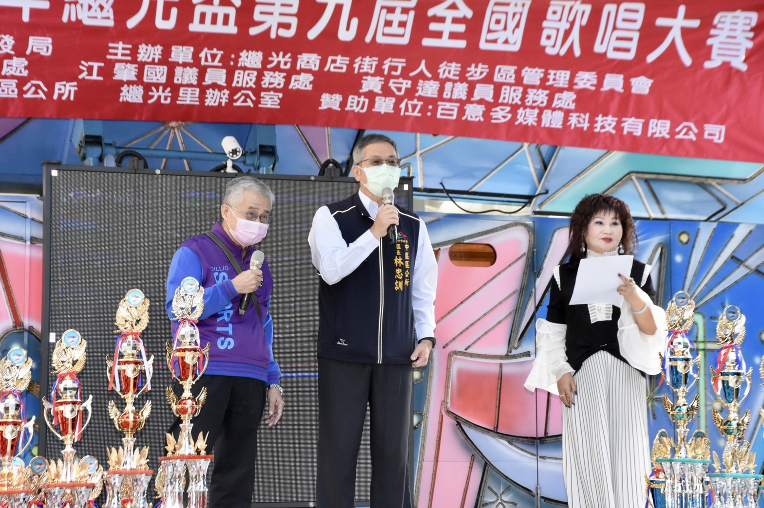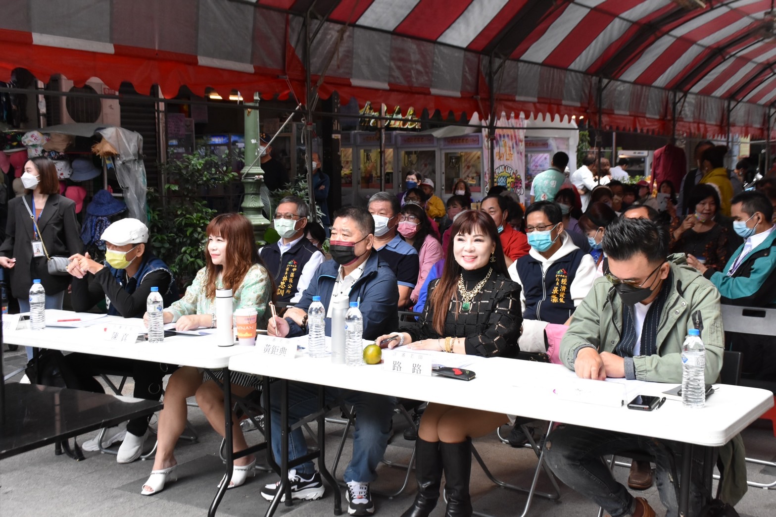 今日歌唱大賽,包含市議員黃守達、經發局長張峯源、中區區長林忠訓、繼光里長吳禎耀、台中市商圈觀光文化產業聯合會理事長張聖明、繼光街商圈主委林錦源、自由路商圈主委王允伶皆到場支持,市議員張彥彤、江肇國也派代表出席。(11/6*8)*經發局