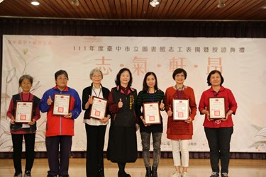 蕭主任秘書指出,台中市立圖書館志工團隊在去年整體表現傑出,榮獲具有志工界「奧斯卡」美名的文化部「全國績優文化志工表揚獎勵團隊獎」,今年個人獎項方面更是成績亮眼,在文化部全國績優志工及衛福部志願服務獎項囊括2金、3銀、7銅的佳績。此外,台中市志願服務獎勵也獲得一等獎1名、二等獎4名及三等獎14名,各項獎項總計有1,013人次獲得榮耀肯定。