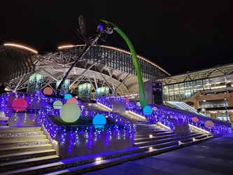 從台北搭車來台中訪友的民眾,行經火車站大平台見到台中火車站大階梯猶如藍色燈海,還飄浮著一顆一顆糖果色系繽紛的耶誕燈球,忍不住拿著手機拍照,搭配廣播系統播放的耶誕歌曲,溫暖的旋律迴繞在各個角落,呼應日劇「First Love初戀」主軸為「藍色是屬於愛人們的顏色」,讓追劇的乘客直呼,「台中,好浪漫的城市!」