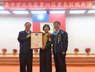 歐陽區長表示,里長是政府推動業務與民眾溝通的重要幫手,今日正式就職,也象徵榮耀和責任將都託付在里長身上,此次共有37位里長連任成功,感謝連任里長長期對公所各項施政的協助配合,北屯區里建設成果有目共睹,期盼連任里長與新任里長相互交流,分享里政治理經驗,全力以赴為里民打拚,持續關懷照顧民眾的需求,與市府、公所團隊及各機關團體攜手提升北屯區公共建設及福祉,營造優質社區、推動幸福北屯。