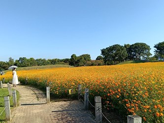 陳局長補充,后里環保公園位於后里區堤防路北側,佔地達17公頃,園內設有林蔭步道、廣闊草坡、寵物專區與完善的休閒設施,是假日散步、野餐、放風箏與親子同遊的好去處,園內除黃波斯菊外,落羽松林也悄然轉色,金黃與橘紅交織如畫,構築出浪漫的「雙重秋色」。在同一場域中同時欣賞兩種截然不同卻同樣迷人的秋日風情,讓民眾彷彿置身童話畫境。