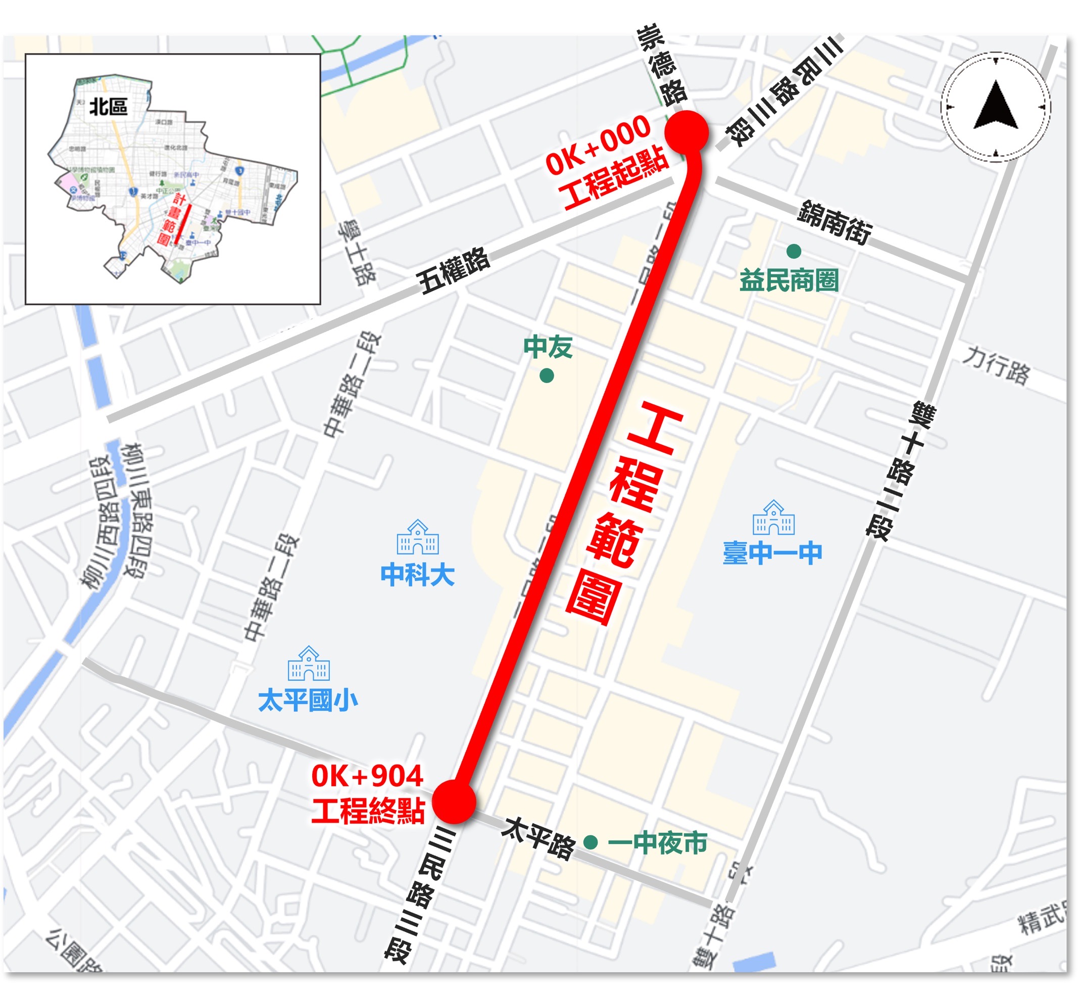 台中市長盧秀燕高度重視行人安全與道路品質,為優化台中科技大學及一中商圈周邊人行環境,台中市政府建設局將於近期投入8,029萬元啟動「北區三民路三段(太平路至五權路)人本改善工程」,預計改善道路全長約904公尺,工程內容包括拓寬實體人行道為2.5至4公尺、改善道路燙平面積約2.2公頃,並增設無障礙斜坡道、庇護島及號誌纜線下地等設施,全面提升行人通行安全及都市景觀品質。