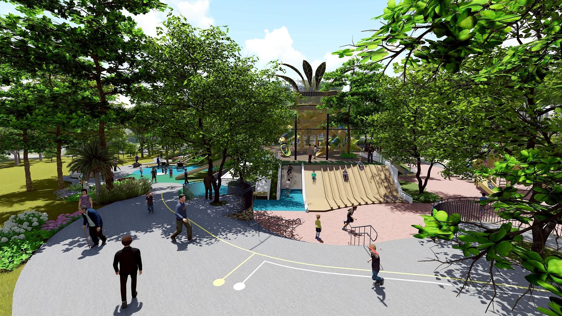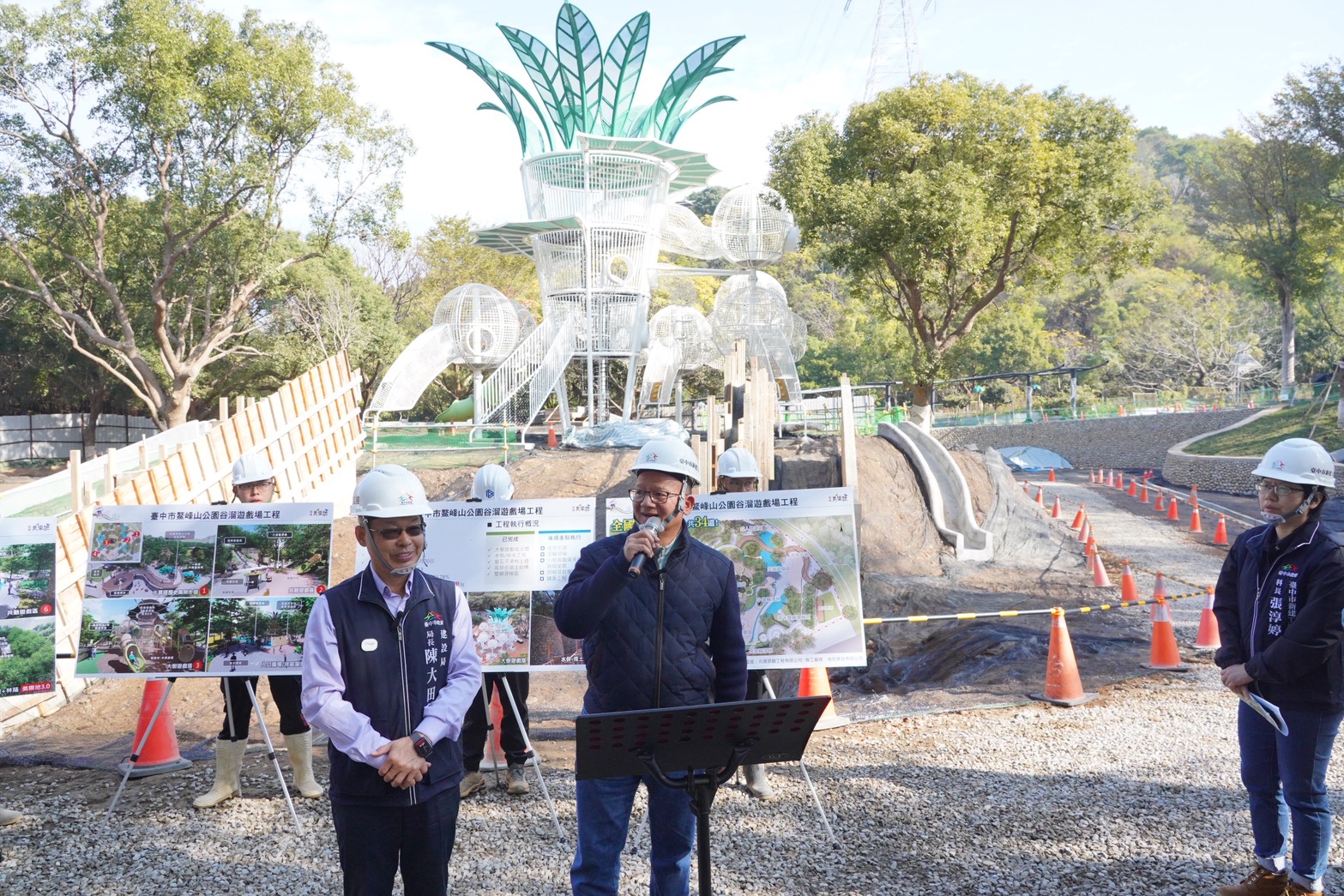 建設局補充,考量基地位處坡地環境,工程規劃初期將水土保持與排水系統列為重點工項,目前相關設施均已完成,可有效提升邊坡穩定與排水效能。另遊戲場亮點大樹遊戲塔亦近完成,後續將依序進行滾輪溜滑梯及相關遊具安裝作業,並同步辦理地坪鋪面等土建工程,逐步完善整體遊戲場機能與使用安全。後續施工將嚴格控管施工品質與安裝精度,並加強工區分流與安全防護措施,確保工程進度穩定推進,為後續啟用奠定良好基礎。