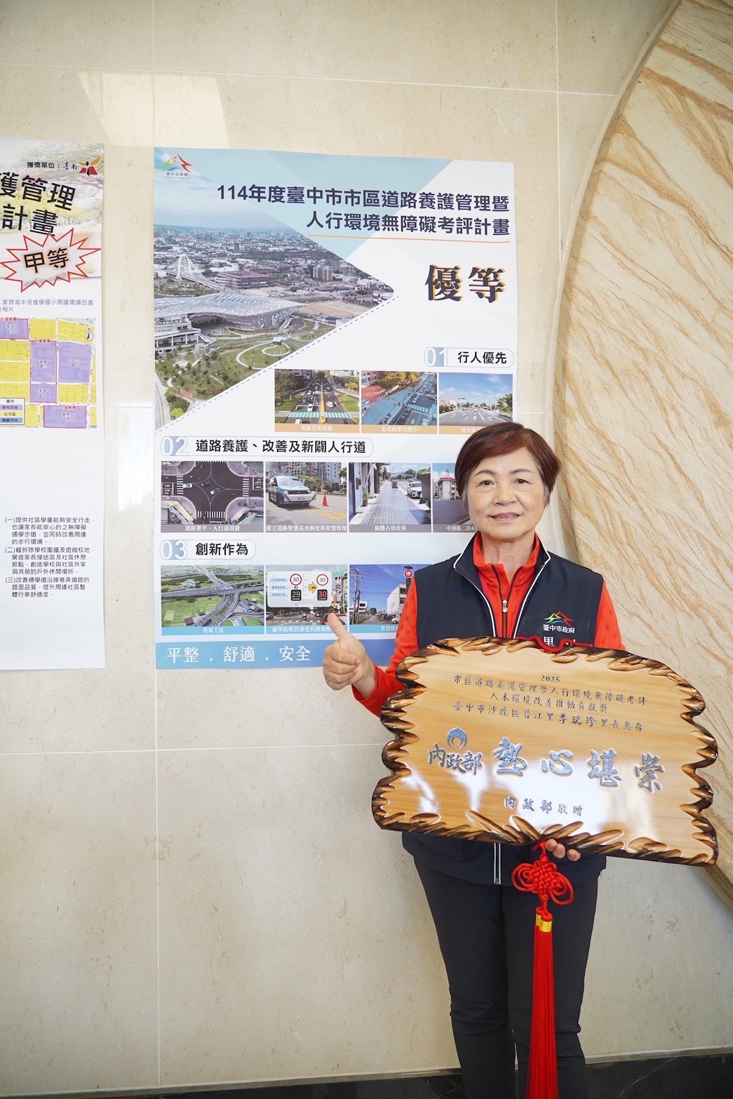 建設局說明,此次工程於路口導入「標線型人行道外推」並設置防撞軟桿,可有效防止汽、機車轉彎時以「切西瓜」方式影響行人安全,對推嬰兒車、輪椅使用者及高齡者尤為友善。此外,晉江里長李瑞珍長期配合市府推動台灣大道六、七段及北勢東路人本環境改善,積極協助凝聚地方共識、促進工程順利推動,並因此榮獲國土管理署頒發「地方貢獻獎」,展現地方與市府攜手合作的成果。